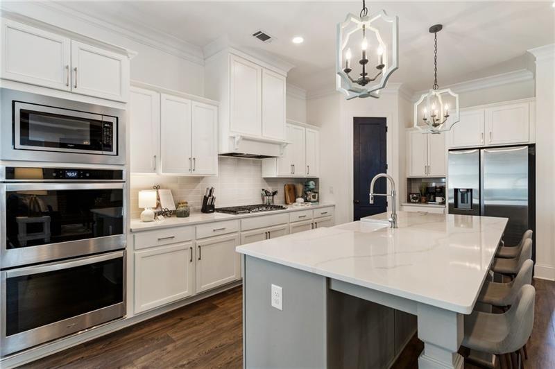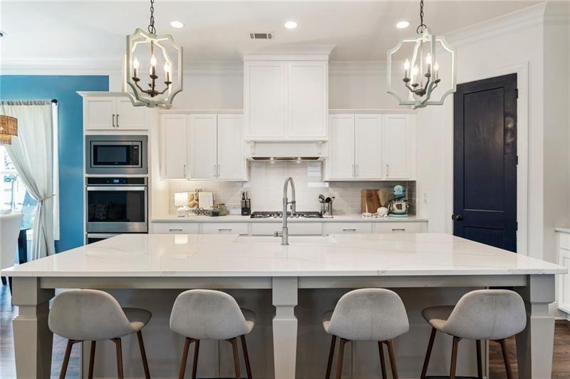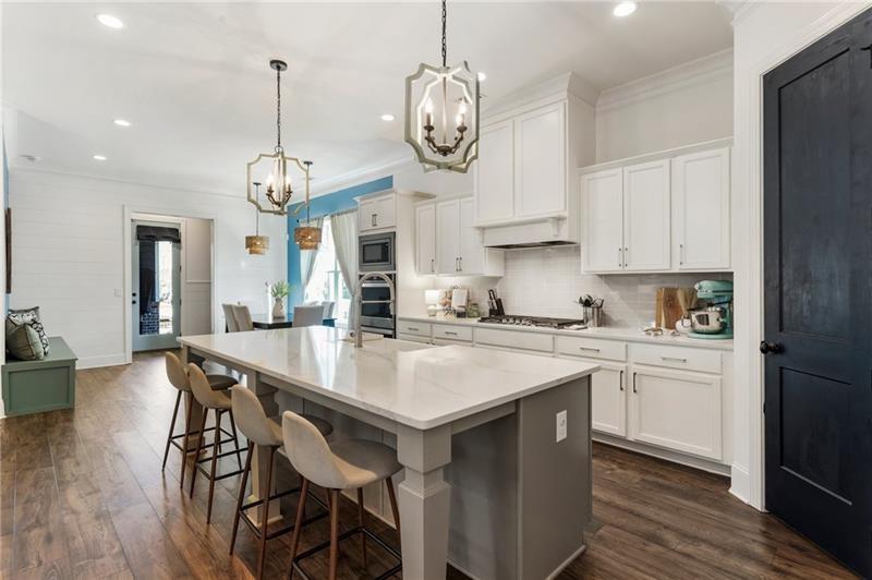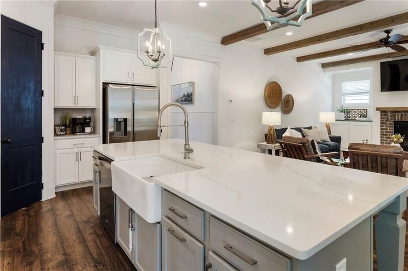 - KitchenBreakfast Bar, Cabinets White, Eat-in Kitchen, Keeping Room, Kitchen Island, Pantry, Pantry Walk-In, Stone Counters, View to Family Room