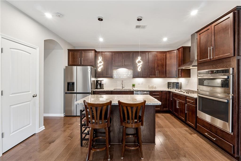 - KitchenCabinets Stain, Kitchen Island, Pantry, Stone Counters, View to Family Room