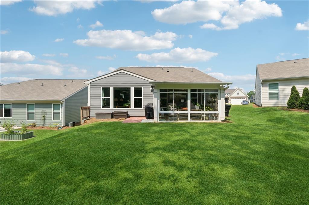 Elegant Ranch in Gated 55+ Community – Premium Private Lot Welcome to this like-new, meticulously maintained 3 bedroom, 2 bath one level home with a desirable open floorplan and upscale finishes throughout. A charming rocking chair front porch sets the tone, while lawn maintenance provided by the HOA means carefree living. Inside, an elegant entry foyer with arched opening leads to a large office with glass double doors—ideal for private office or as a possible third bedroom. The gourmet kitchen features wood stained cabinetry with pull-out drawers, granite counters, pantry and upgraded stainless steel appliances including a five-burner cooktop, all overlooking the dining room with wainscoting and the spacious great room. The great room opens into a bright sunroom, perfect for entertaining and flows further into a professionally enclosed all-season porch with views of the private, tree-lined backyard at the end of a quiet street. The primary suite boasts a trey ceiling, hardwood flooring, spa-like bath with oversized glass shower, double sink granite vanity and a huge walk-in closet. A private guest suite, convenient laundry room and two-car garage with overhead shelving, insulated garage walls and door plus two garage windows for natural light, complete the thoughtful layout. Upgraded lighting and ceiling fans throughout add both style and comfort. Set on a premium lot in a gated 55+ active adult community, residents enjoy pickleball, clubhouse activities and a low-maintenance lifestyle—just minutes from shopping and dining.