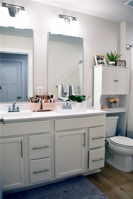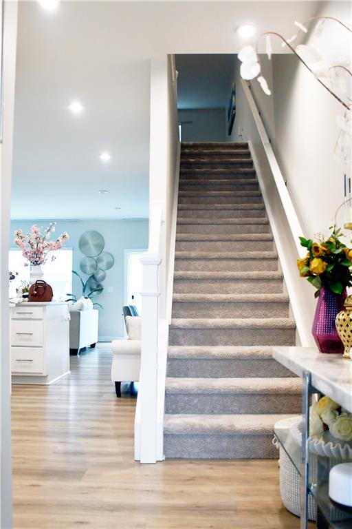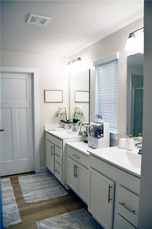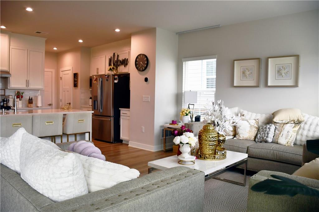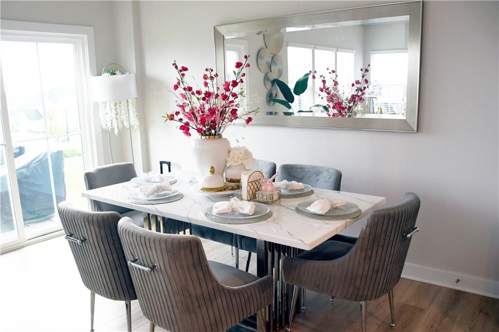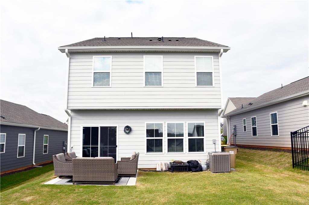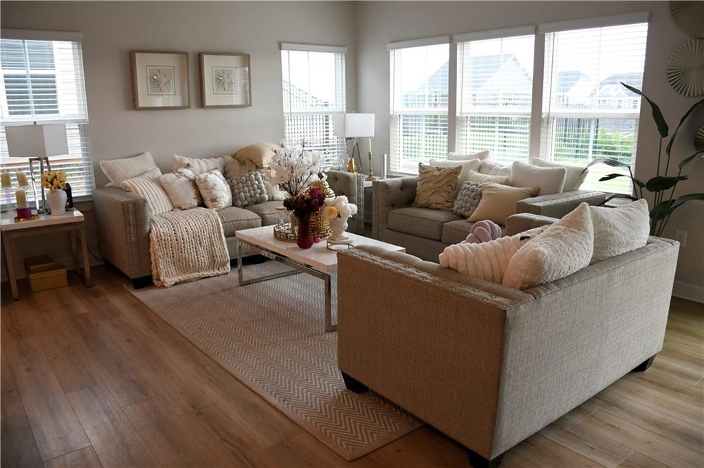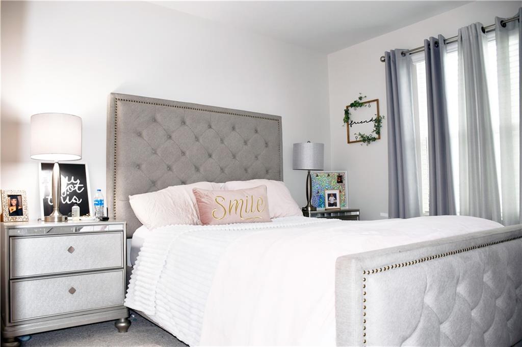 This 2024 home is truly a modern gem with a very welcoming entrance and a double garage. It also features a spacious driveway that can accommodate up to four cars, plus the garage fits two more cars. The upstairs area houses all the bedrooms, and the home features an open floor plan with a kitchen island made of granite. The kitchen has white cabinetry and plenty of natural light thanks to energy-efficient windows. There's a spacious backyard with a lovely green lawn, and the pantry is a walk-in style for extra convenience. Upstairs, in addition to the bedrooms, there's a loft and two full bathrooms. Downstairs, you'll find a half bath. The primary bedroom has a walk-in closet and a double vanity in the bathroom, though it features a shower rather than a tub. There's also an upstairs laundry closet. The home is in excellent condition overall and has luxury laminate flooring.