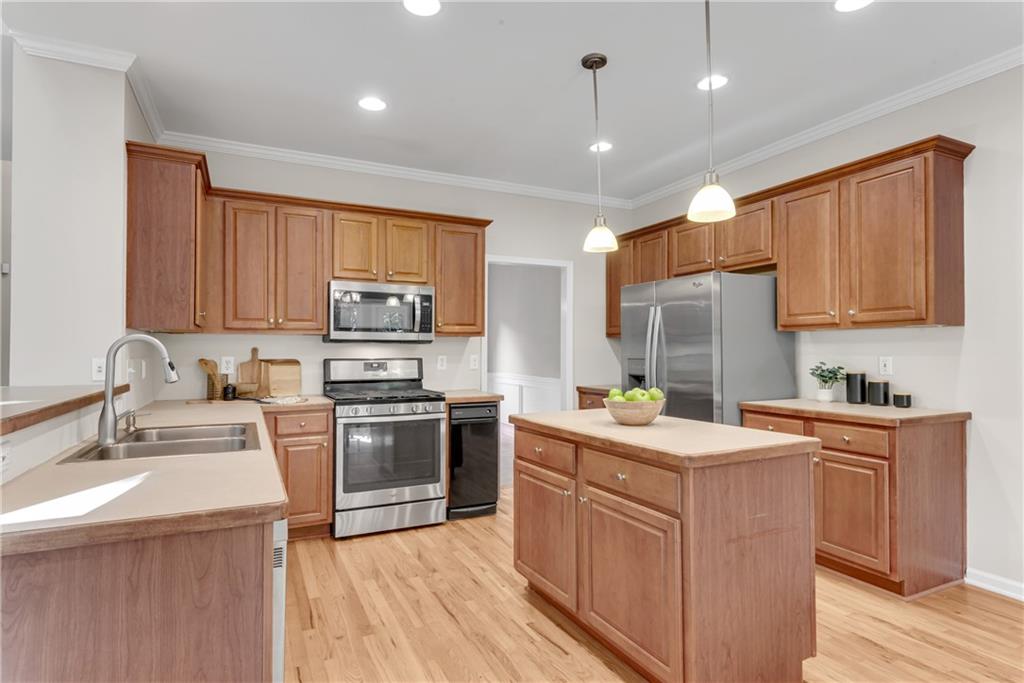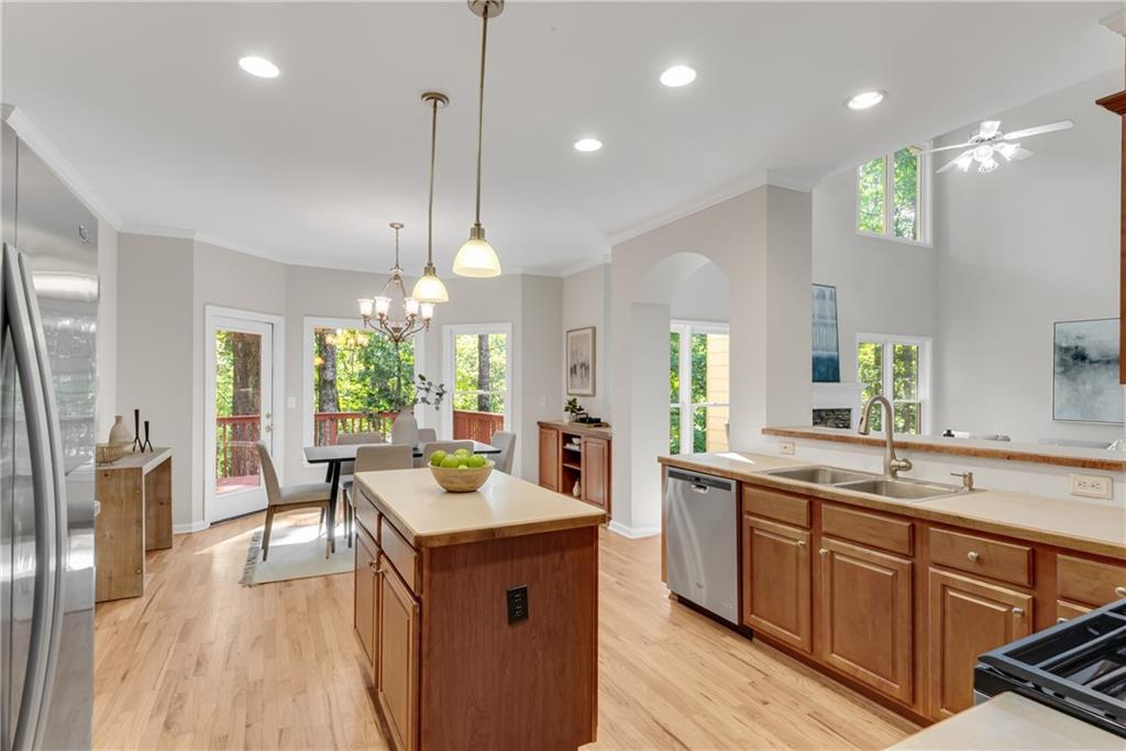 - KitchenCabinets Stain, Eat-in Kitchen, Kitchen Island, Laminate Counters, Pantry Walk-In, View to Family Room