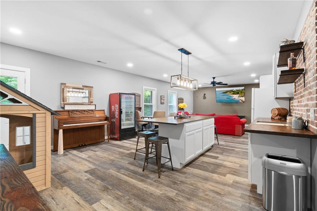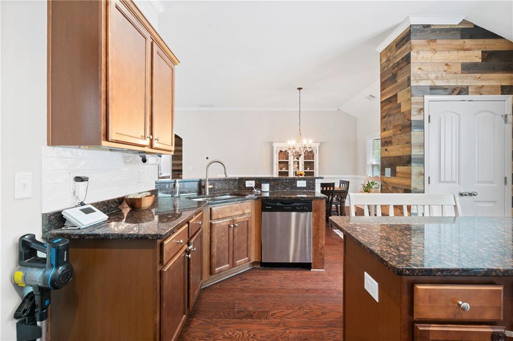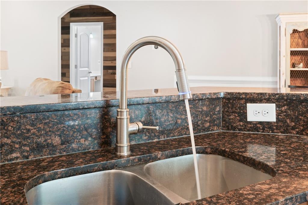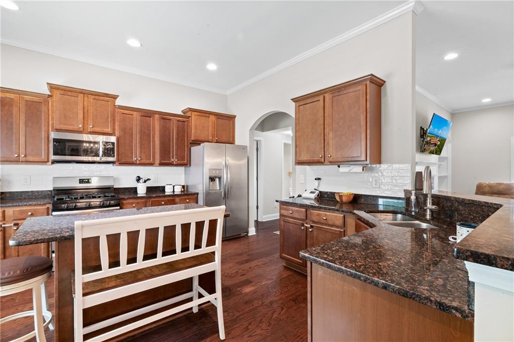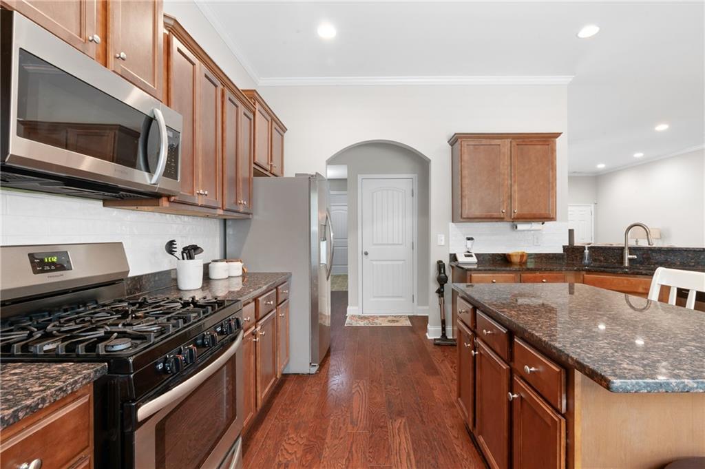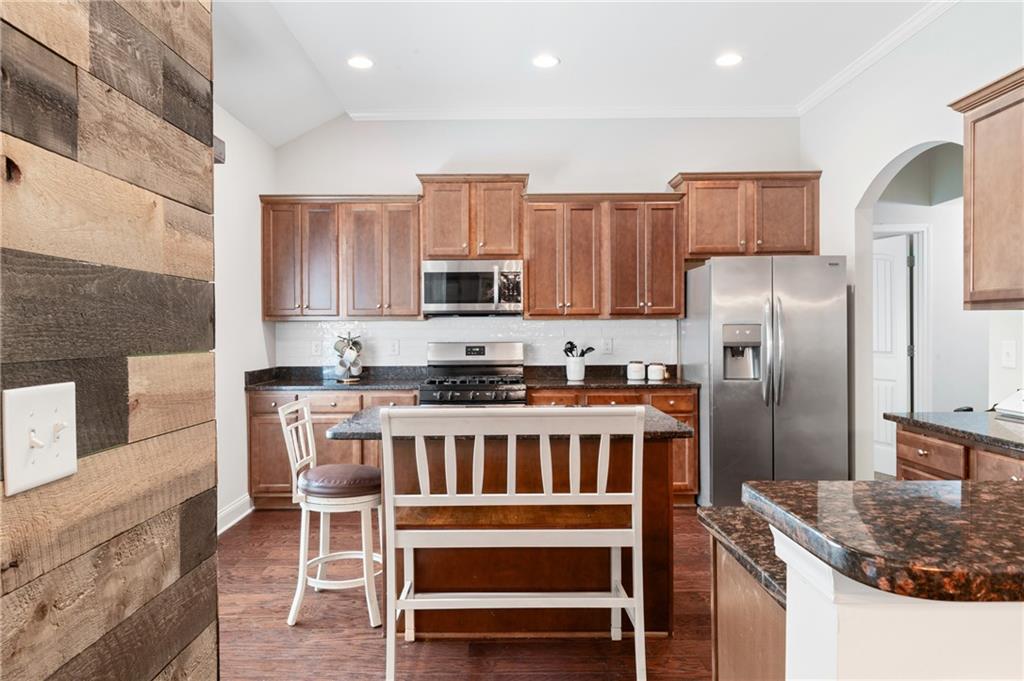 - KitchenBreakfast Bar, Cabinets Stain, Kitchen Island, Pantry, Stone Counters, View to Family Room