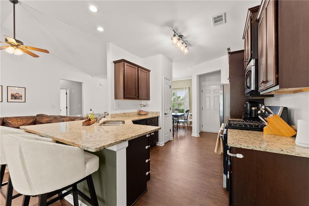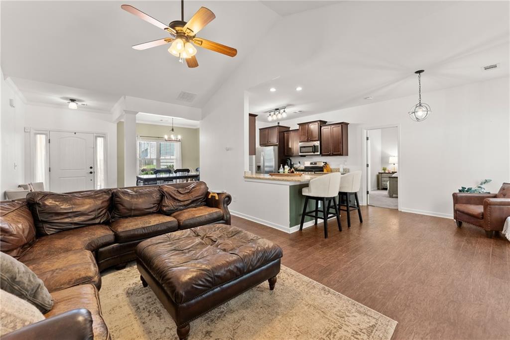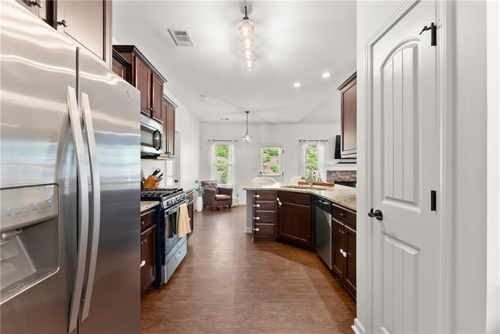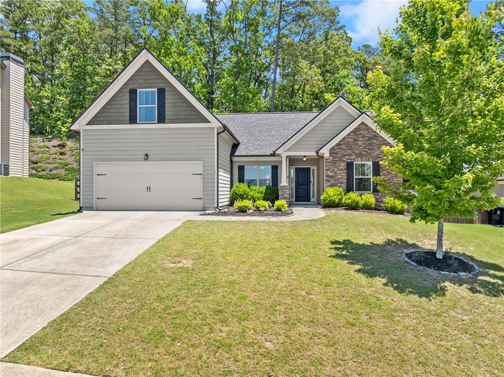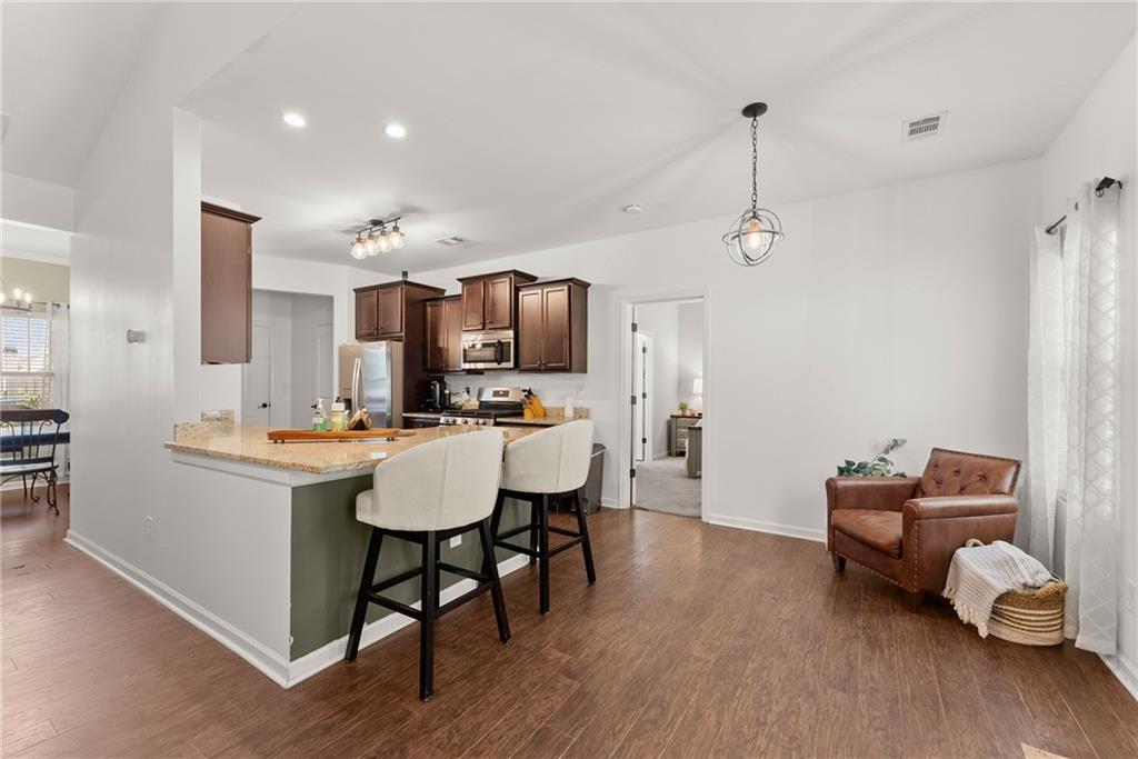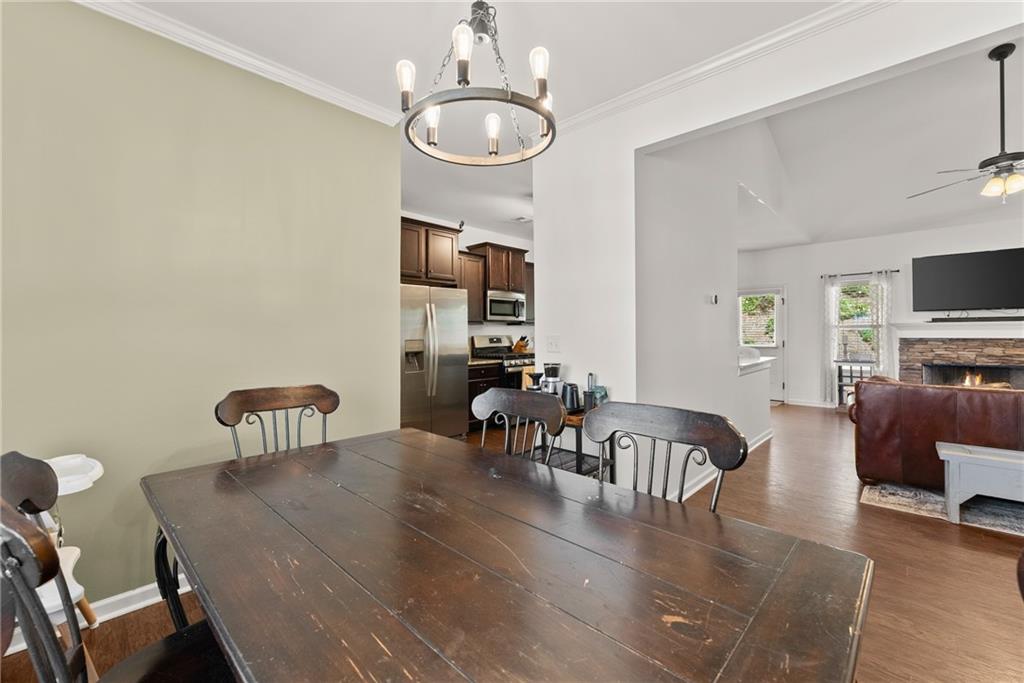 Just 1 mile from Old Town Dawsonville, this charming ranch home combines convenience and privacy in a sought-after location. Enjoy easy access to local shops, restaurants, the city park, and all the small-town charm Dawsonville is known for, plus quick connections to GA400, Highway 9, and Highway 53. Step inside to a welcoming foyer that opens into a spacious, open-concept living room, dining room, and kitchen. The kitchen features wood cabinetry, granite countertops, a breakfast bar, breakfast nook, and a pantry—perfect for both everyday living and entertaining. The primary suite is tucked away off the kitchen, offering a private retreat with a walk-in closet and a spa-like bathroom featuring a double vanity and spacious shower. Two guest bedrooms, a full bathroom, and a laundry room are conveniently located off the main living area. Upstairs, a large fourth bedroom provides endless possibilities as a guest suite, flex space, or home office. Outside, relax on the back deck and enjoy the peace and privacy of your own backyard oasis.