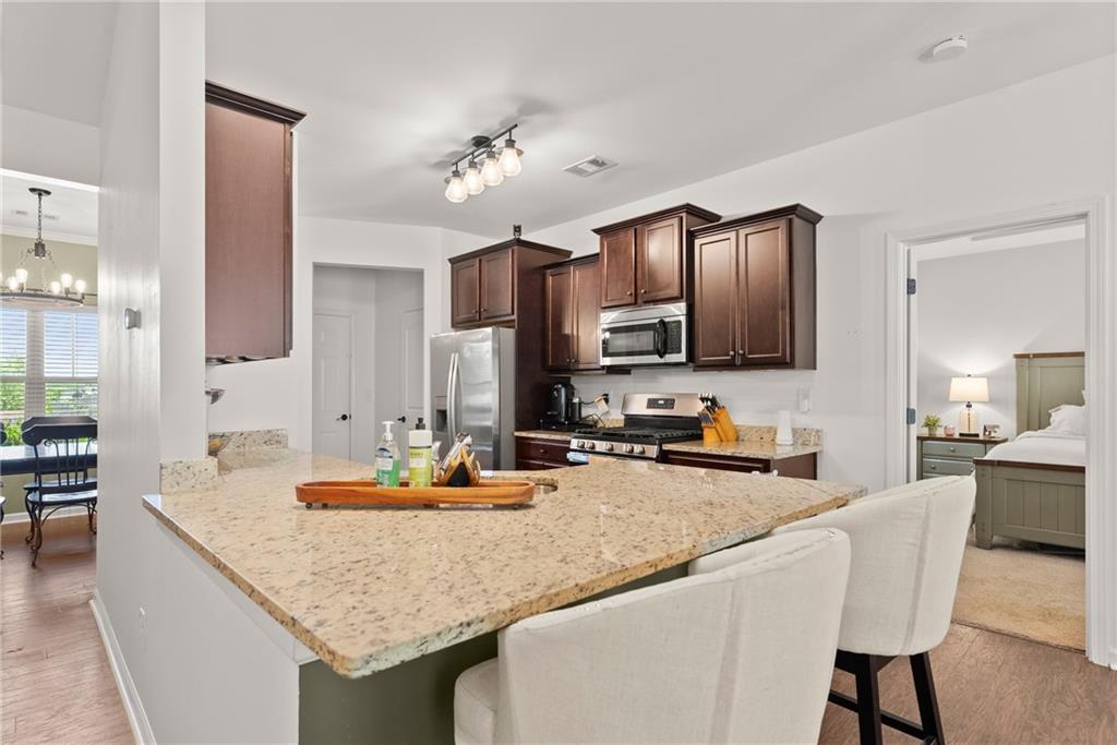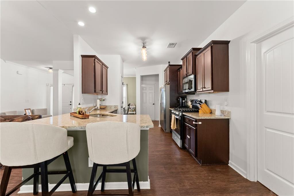 - KitchenBreakfast Bar, Breakfast Room, Cabinets Stain, Eat-in Kitchen, Pantry, Solid Surface Counters, View to Family Room