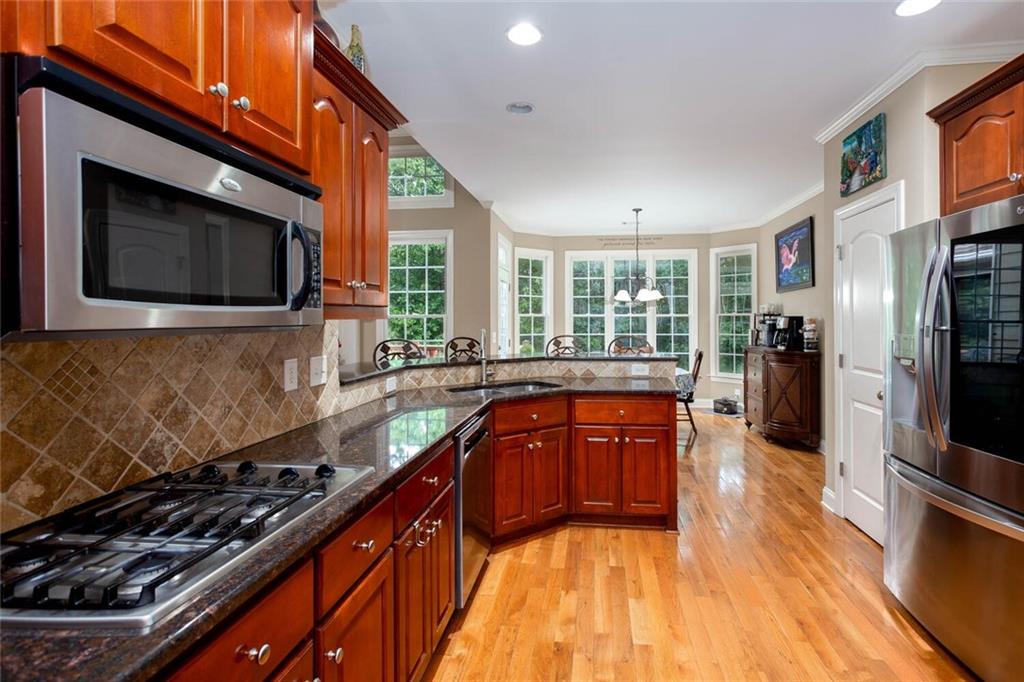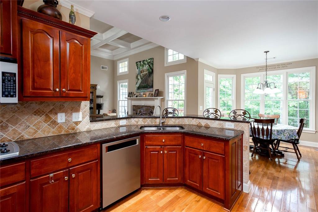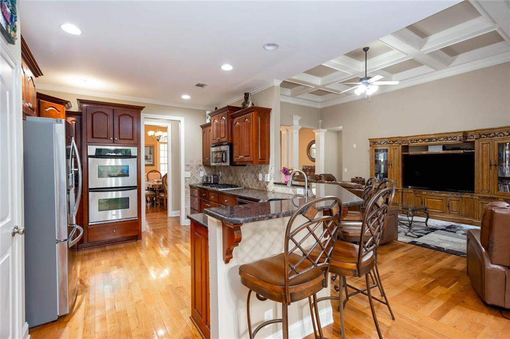 - KitchenBreakfast Bar, Cabinets Stain, Eat-in Kitchen, Pantry, Stone Counters, View to Family Room