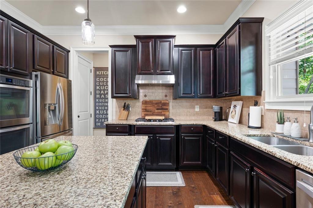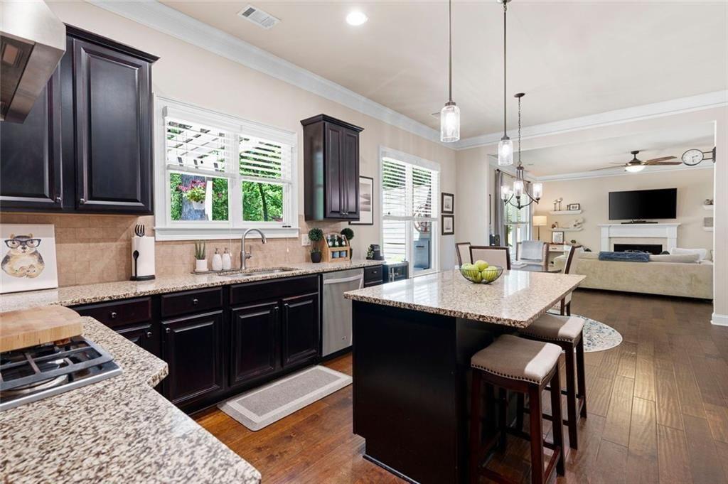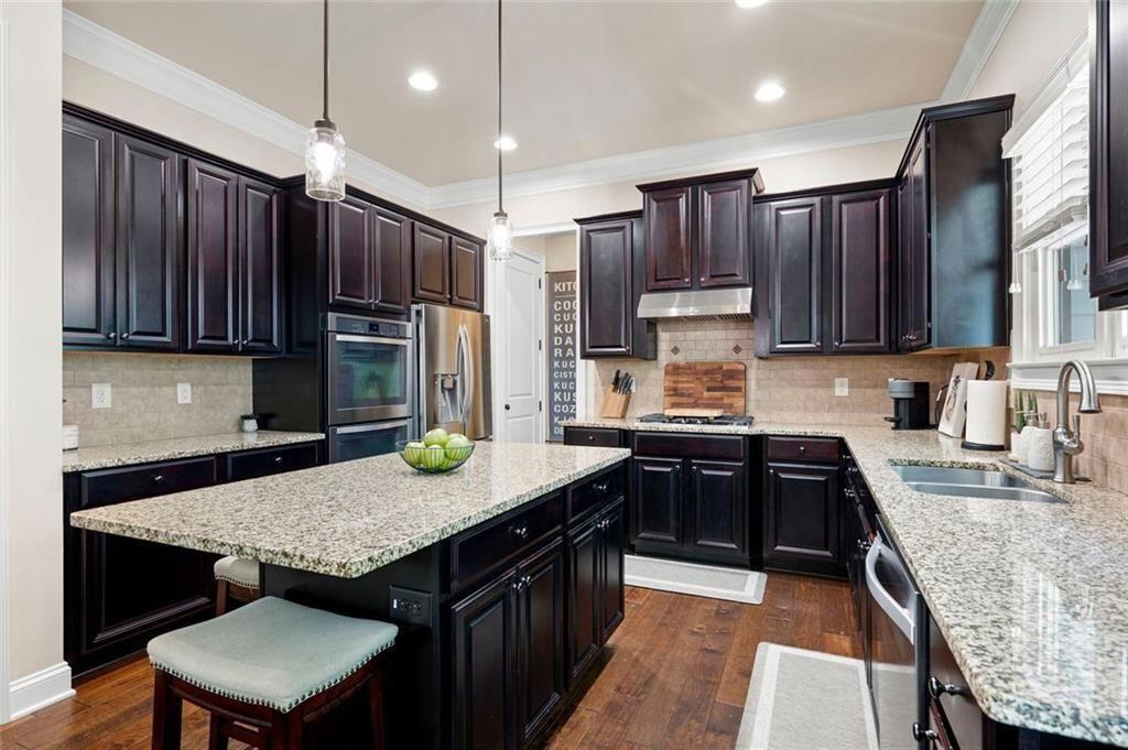 - KitchenCabinets Stain, Eat-in Kitchen, Pantry Walk-In, Stone Counters, View to Family Room, Kitchen Island