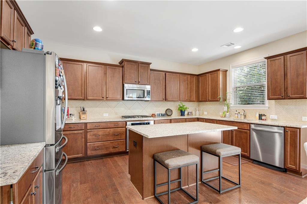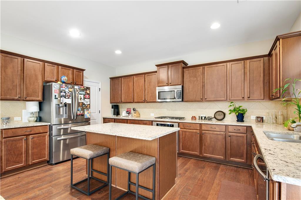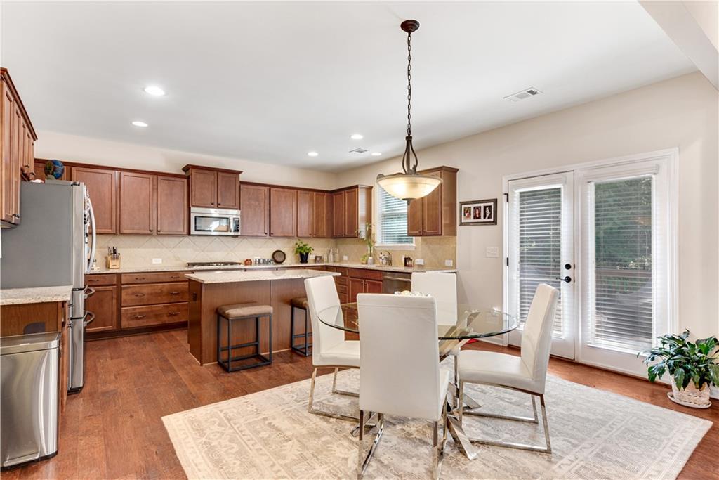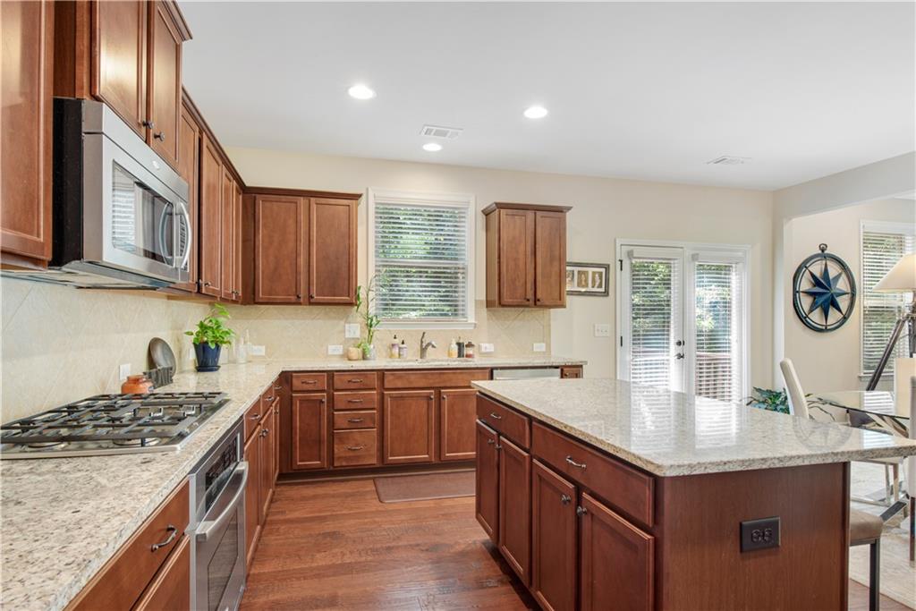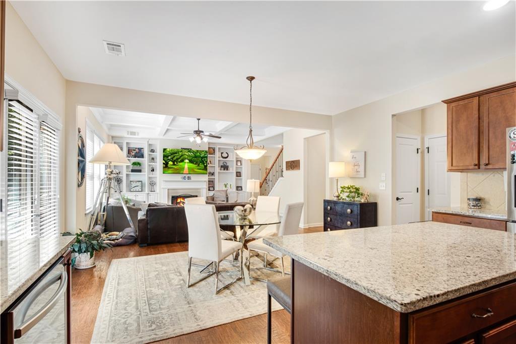 - KitchenBreakfast Room, Cabinets Stain, Eat-in Kitchen, Kitchen Island, Pantry Walk-In, Stone Counters, View to Family Room