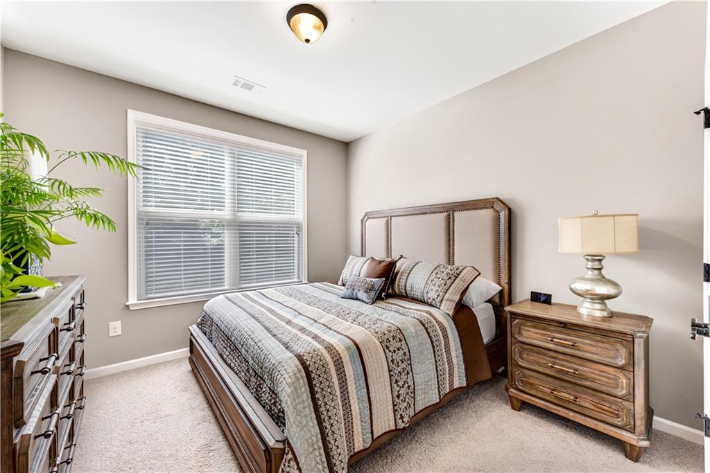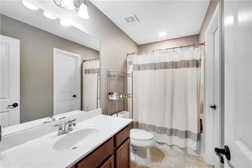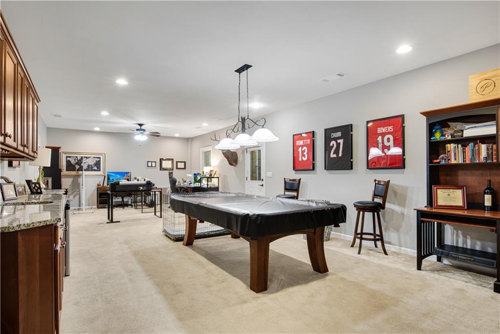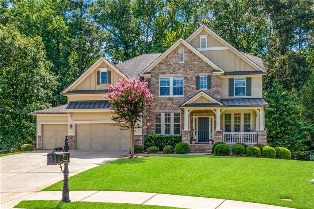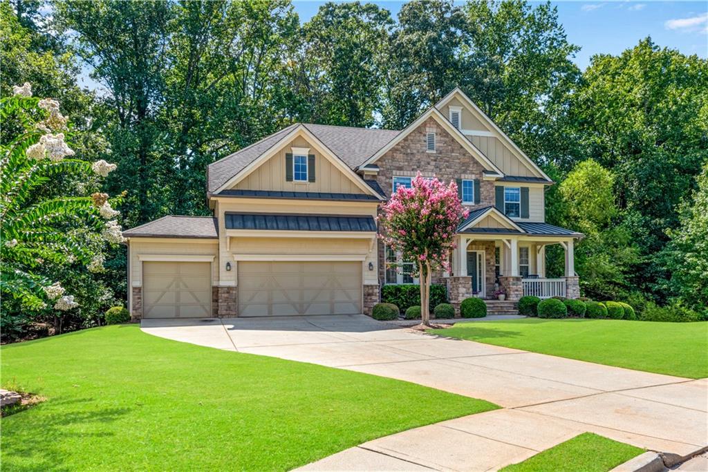 Tucked away on a quiet cul-de-sac in a gated community, this stunning 2-story Craftsman home offers the perfect blend of elegance, space, and comfort. Boasting 6 bedrooms and 4 full bathrooms, a 3-car garage, and a fully finished terrace level, this home has room for everything and everyone. Step into a grand 2-story foyer that leads into a thoughtfully designed main level. You'll find a private office, a formal dining room perfect for entertaining, and an open-concept layout connecting the spacious great room, breakfast area, and kitchen. The kitchen is a chef’s dream with richly stained cabinetry, granite countertops, island, and walk-in pantry. Upstairs features 4 generously sized bedrooms, including a luxurious oversized primary suite with his-and-hers walk-in closets. The spa-like en-suite bath includes dual vanities, a soaking tub, and a separate shower bathed in natural light. Bedroom 2 features its own walk-in closet, while bedrooms 3 and 4 share a convenient Jack-and-Jill bath. A separate elevated loft space provides the perfect spot for a second office, playroom, or media room! The finished terrace level adds even more living space, complete with a bedroom, full bathroom, kitchenette, and a large entertainment area ideal for hosting guests or relaxing with family. There is also plenty of storage in the unfinished space. Enjoy peaceful mornings and evenings on the rocking-chair front porch, and experience wooded privacy in the backyard. This home is located in a gated and well-maintained community with excellent schools nearby. As an added bonus, internet and basic cable are included with HOA fees. Close to shopping and restaurants!
