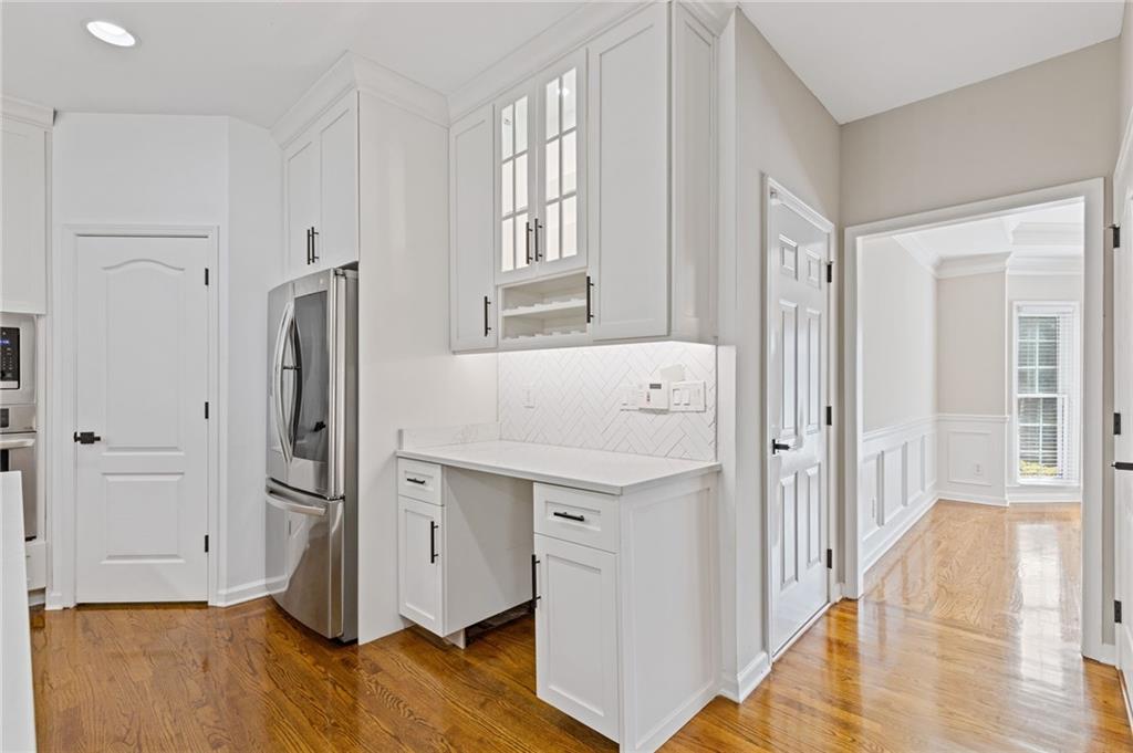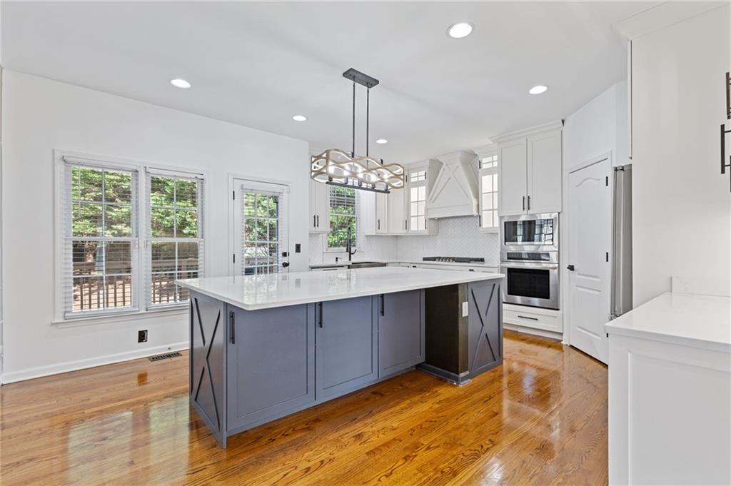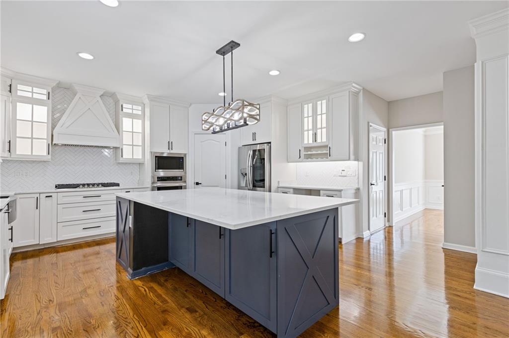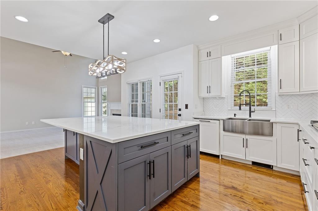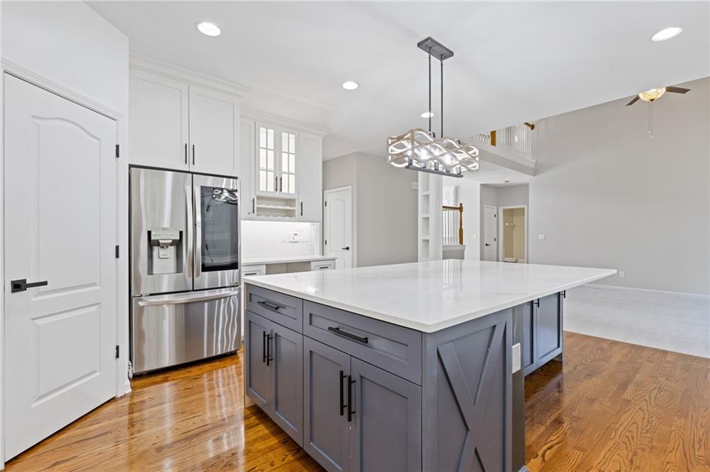 - KitchenBreakfast Bar, Cabinets Other, Cabinets White, Eat-in Kitchen, Kitchen Island, Pantry Walk-In, Stone Counters, View to Family Room