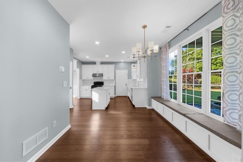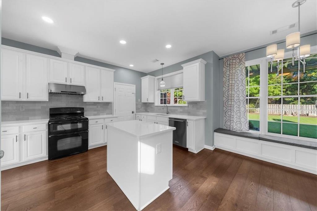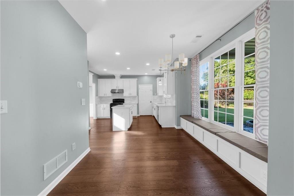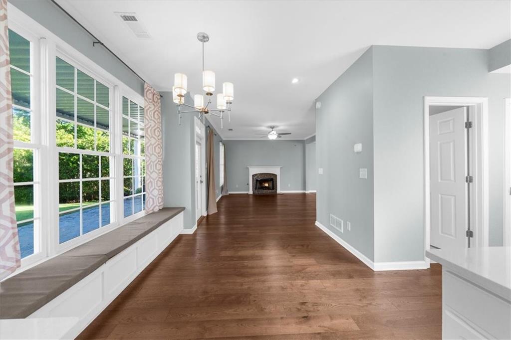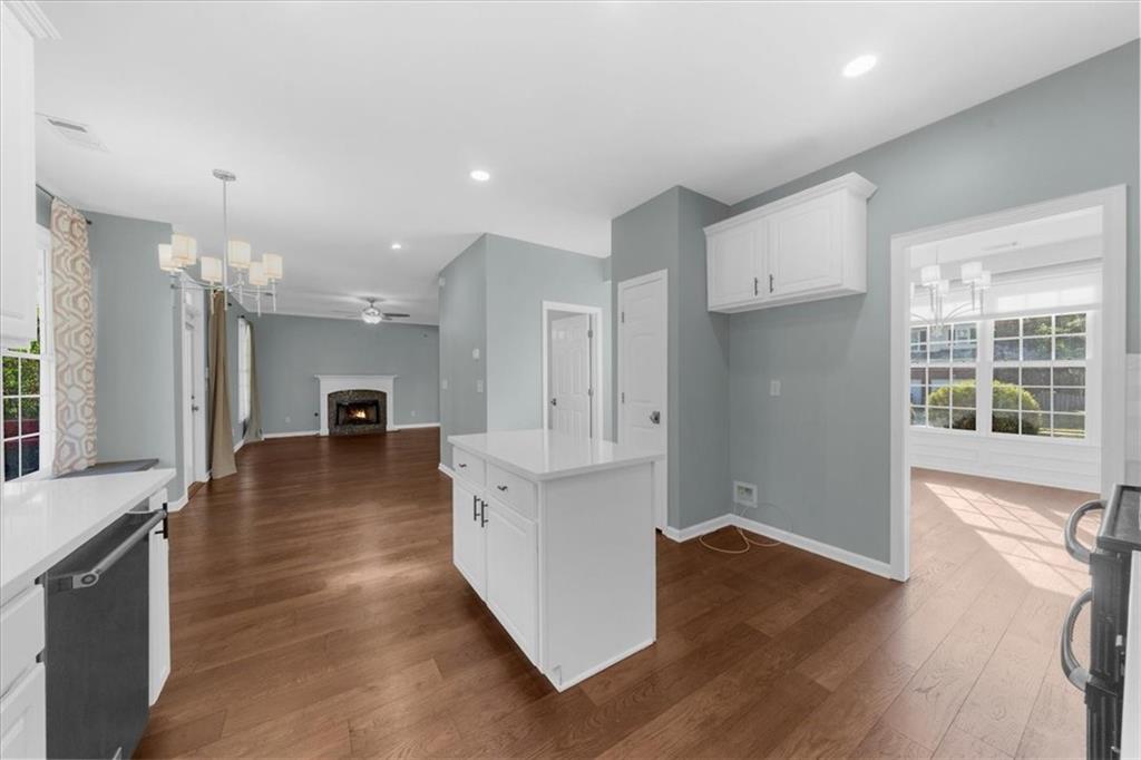 - KitchenBreakfast Room, Cabinets White, Eat-in Kitchen, Kitchen Island, Pantry, Solid Surface Counters, View to Family Room