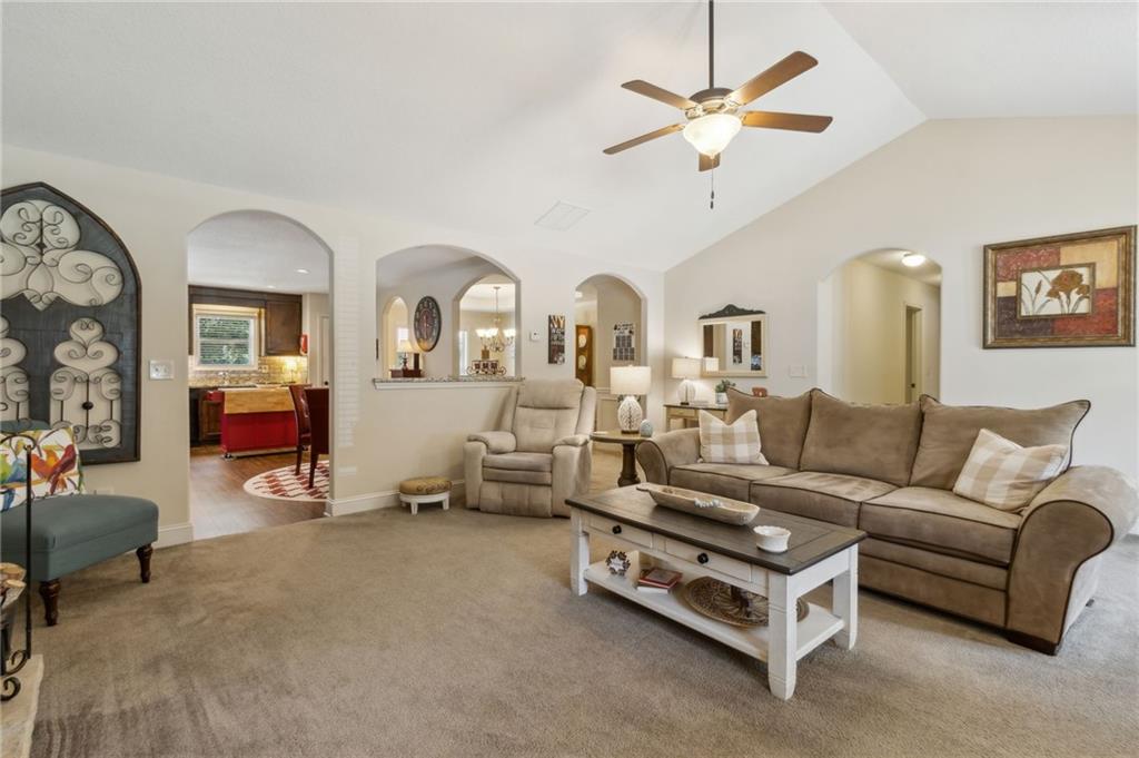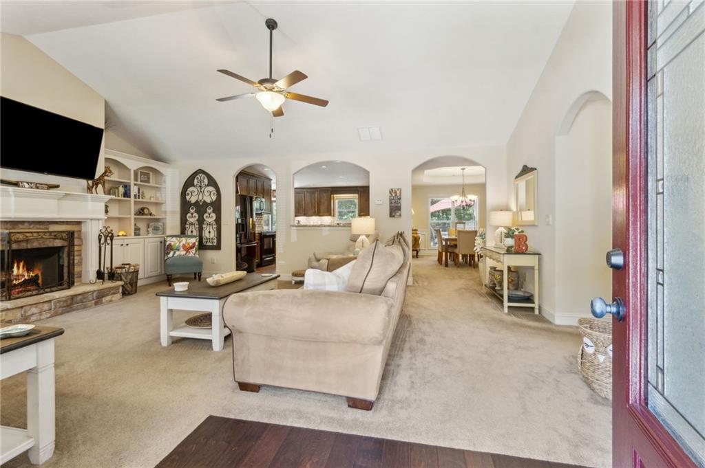Lake Living at Its Finest! Welcome home to this beautifully maintained stepless ranch in the highly sought-after Cambridge Farms community. Start your mornings on the inviting rocking chair front porch before stepping into the open-concept family room, complete with custom built-ins and a stone fireplace. The large farm-style kitchen features stunning granite countertops, stained cabinetry, tile backsplash, black appliances, and a breakfast nook overlooking the spacious dining area-perfect for gatherings. The owner's retreat offers breathtaking panoramic lake views, a generous walk-in closet, and a spa-inspired ensuite with double doors, soaking tub, separate shower, and dual vanities. Two secondary bedrooms share a full bath, while a private fourth bedroom includes its own ensuite-ideal for guests. Additional highlights include a spacious laundry room and oversized two-car garage. Step out back to the patio and composite deck overlooking the lake, where you can watch abundant wildlife, relax with a view, or cast a line right from your own backyard. This home truly blends comfort, style, and the serenity of lakeside living-don't miss it!