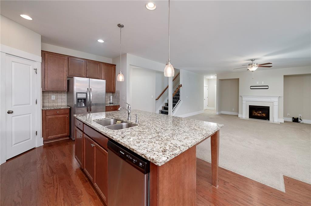 - KitchenBreakfast Bar, Cabinets Stain, Kitchen Island, Pantry Walk-In, Solid Surface Counters, Stone Counters, View to Family Room