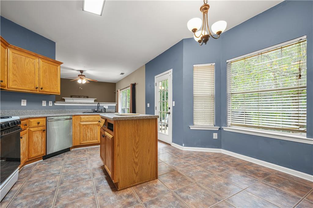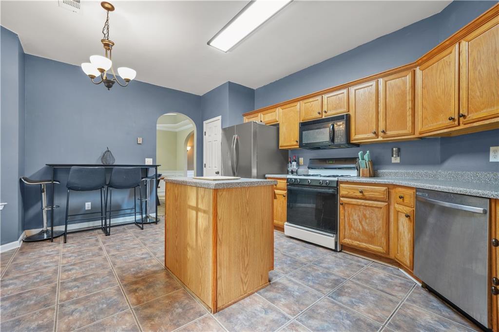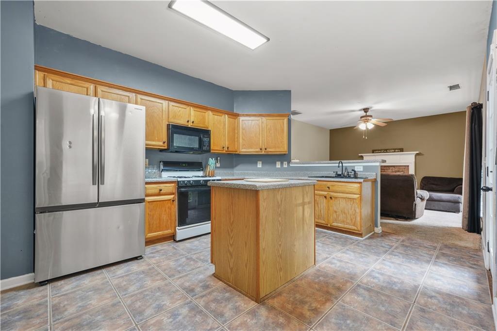 - KitchenCabinets Stain, Eat-in Kitchen, Kitchen Island, Laminate Counters, Pantry, View to Family Room