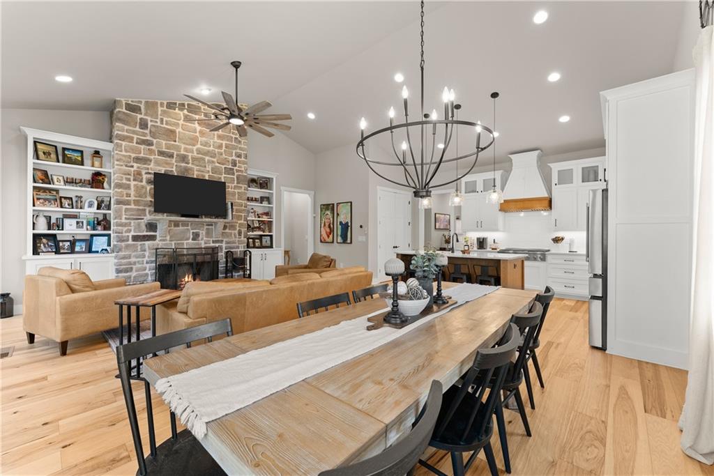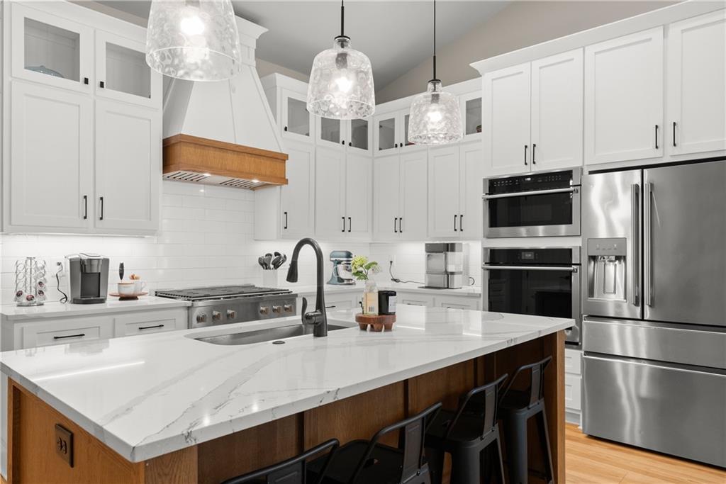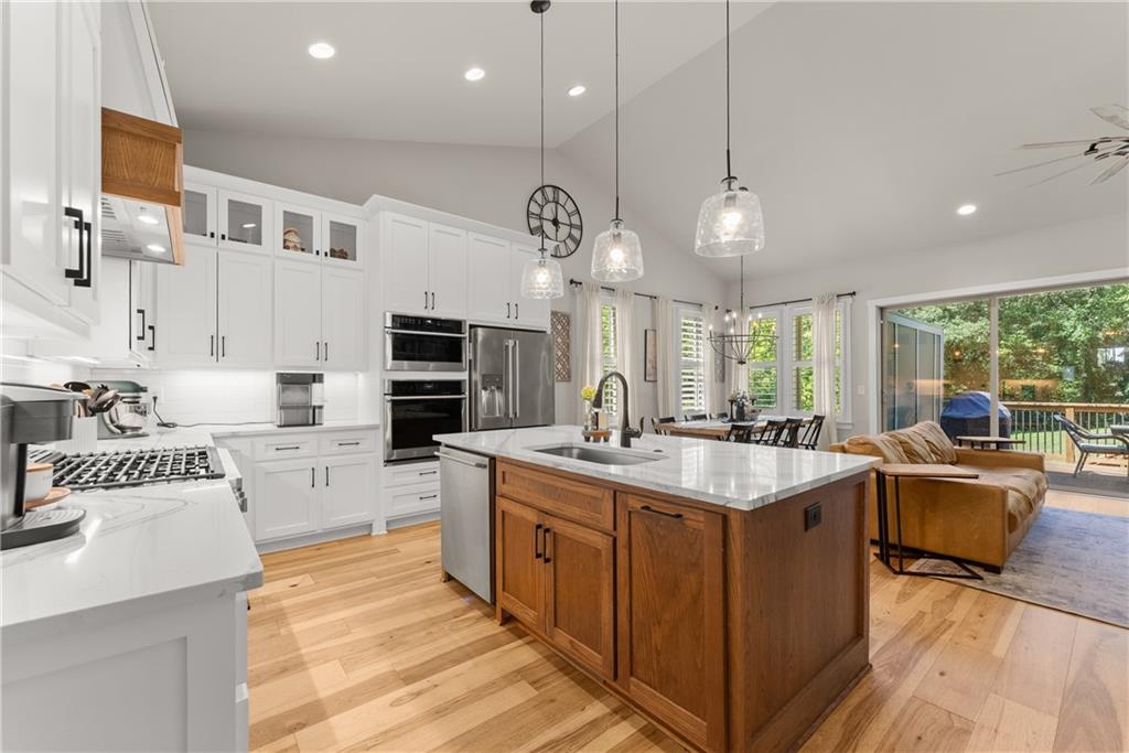 - KitchenCabinets White, Kitchen Island, Pantry, Stone Counters, View to Family Room