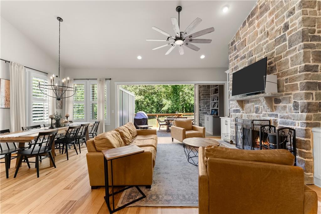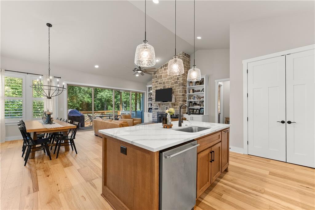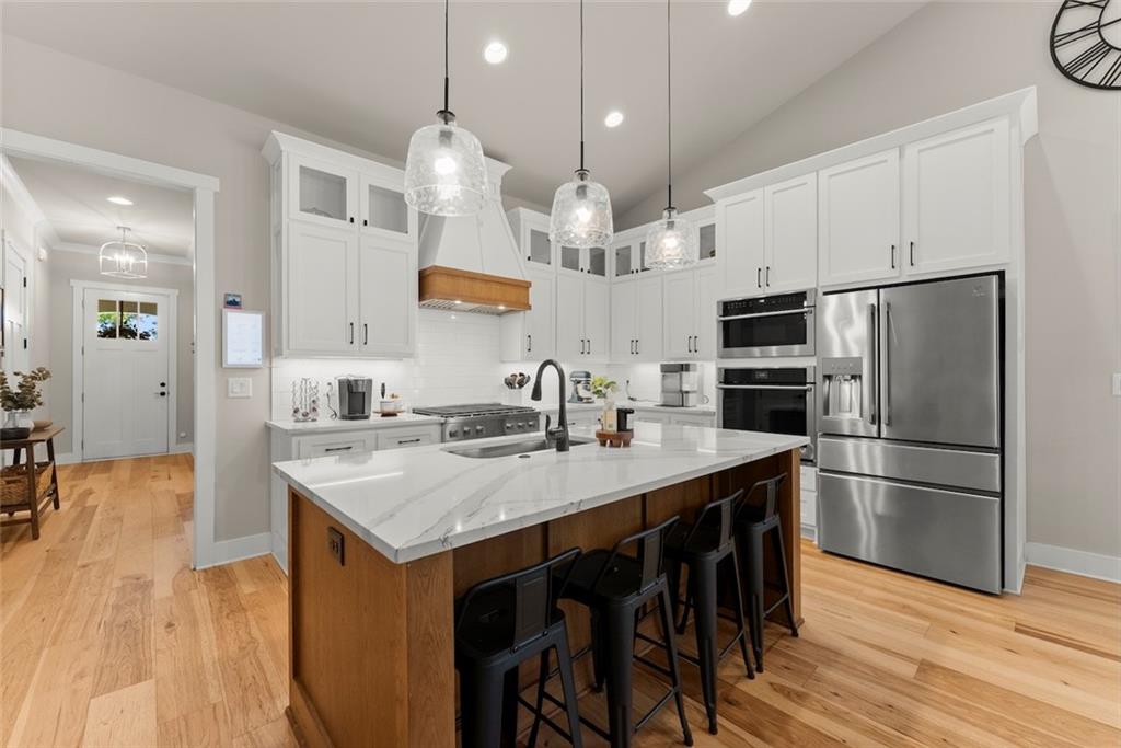 Situated in the lakeside community of The Cottages of Lake Lanier, you will find an amazing opportunity to own one of the original 11, custom built luxury homes. This charming, craftsman home welcomes you to sit on the front porch and enjoy the cool, fall nights. Entering the home, you will be instantly drawn to the beautiful LVP floors on the main level that lead you into the open concept kitchen, great room and dining room. The gourmet kitchen features top-of-the-line Electrolux appliances, a large island, beautiful quartz countertops and plenty of cabinets and a pantry for storage. Enjoy entertaining guest in the great room and dining room while you prepare your holiday meals. Stay warm and cozy this winter in front of your grand, stone fireplace that easily becomes the center of attention adorned with customs built-ins and a lovely, vaulted ceiling overhead. Ready to host the next football game? Easily bring everyone together when you open the 16-foot slider allowing the deck to become part of the entertainment area. The covered portion of the deck features an outdoor fireplace, area for a tv and direct access to the owner's suite. Need some time to yourself? Head to the owner's suite that features a custom, wood accent wall and nice-sized en suite with large, tiled shower, double vanity and walk-in closet. You will find the same custom, wood accent wall in the water closet. In addition to the owner's suite there is an additional room you may use as a second bedroom or as an office, full bath and laundry on the main level. The 10-foot ceilings and 8-foot doors give you the open, airy feel. Head downstairs to the finished terrace level. The terrace level features two bedrooms, a full bath with tub/shower combo, storage area under stairs, rec room and kitchenette/wet bar with wine fridge. The back yard has been sodded and fenced. Newly added stairs on the back deck make accessing the yard a breeze. The patio off of the terrace level is perfect for a hot tub and additional seating for entertaining guest. 2.5 car garage is perfect for your golf cart, workbench or additional storage. Bask in the privacy of this gated community featuring a 6-acre park with walking trails just for residents. The HOA is responsible for yard maintenance, trash pick-up, the neighborhood septic system and the gated entrance allowing for more time spent enjoying your home, entertaining and hassle-free living. Don't forget the lakeside community clubhouse that features a full kitchen, bathroom, den, expansive deck and firepit that is easily accessible via the concrete path. All though this home is quietly situated away from the hustle and bustle you are still conveniently located just 10 minutes from the Gainesville square, close to NGHS, minutes to Laurel Park boat ramp, Olympic Rowing Venue and the Atlanta Botanical Gardens-Gainesville. Make this home your personal retreat.