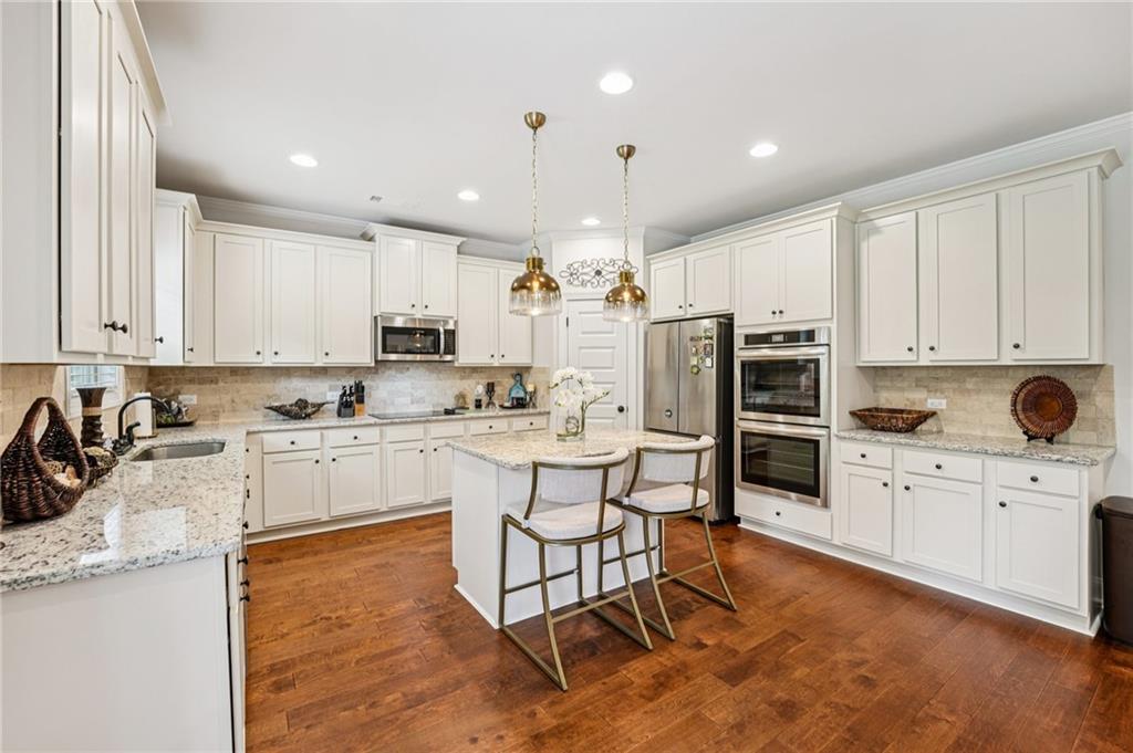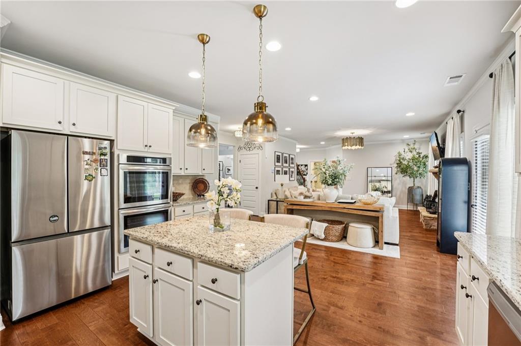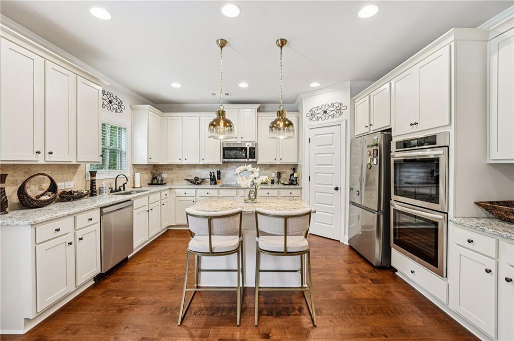 - KitchenBreakfast Bar, Cabinets White, Eat-in Kitchen, Kitchen Island, Pantry Walk-In, Stone Counters, View to Family Room