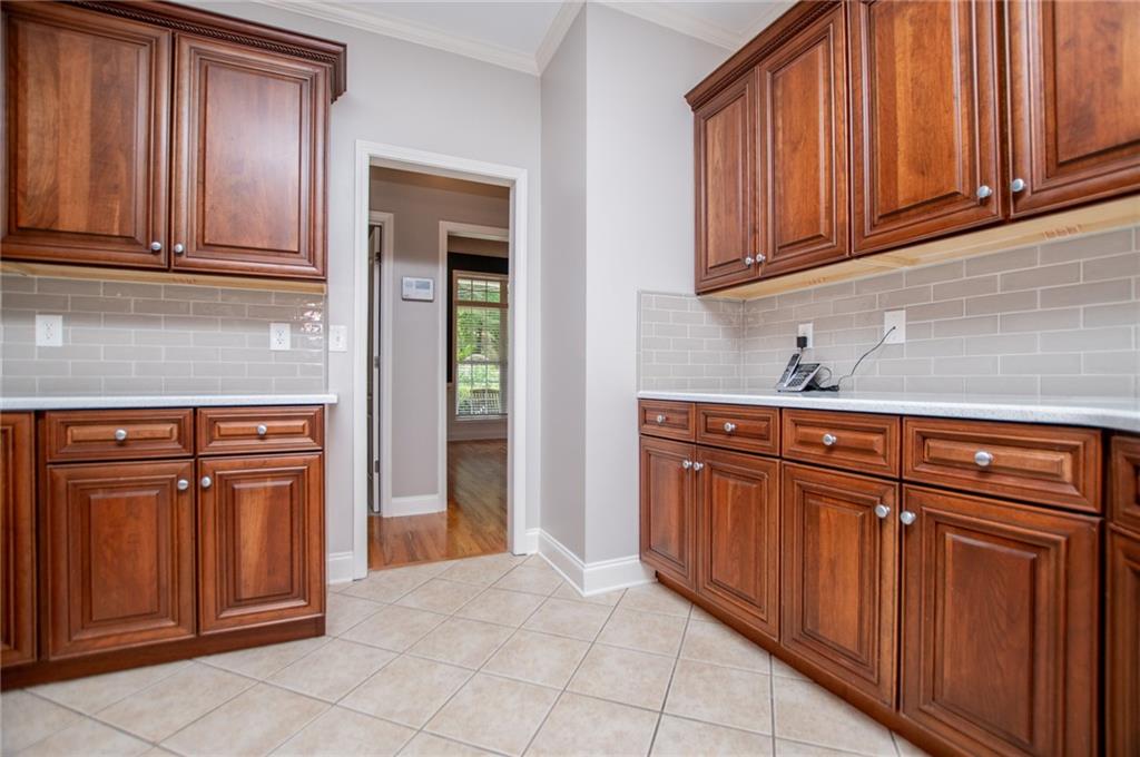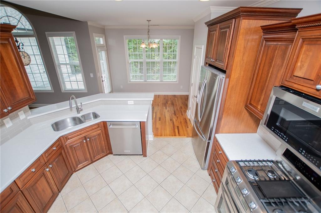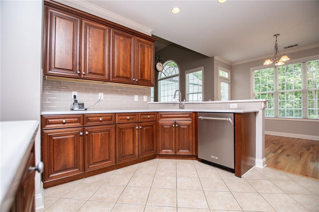 - KitchenBreakfast Bar, Cabinets Stain, Eat-in Kitchen, Pantry, Solid Surface Counters, View to Family Room
