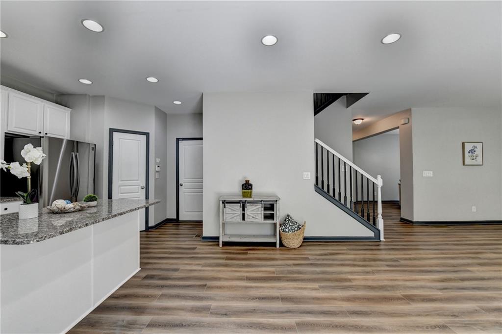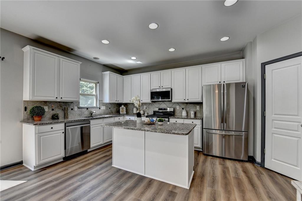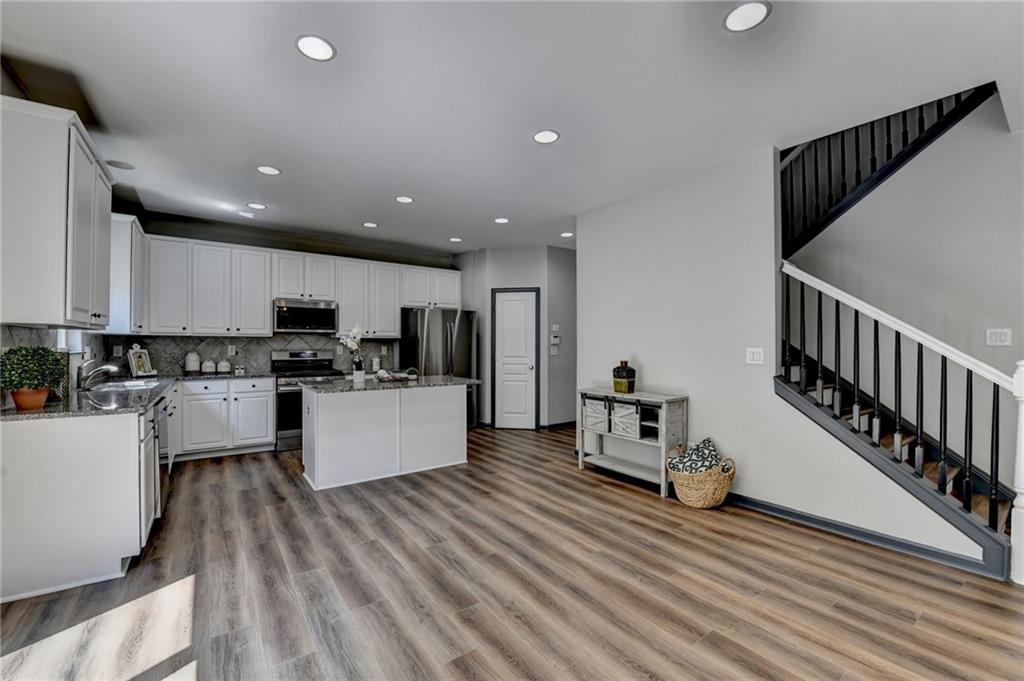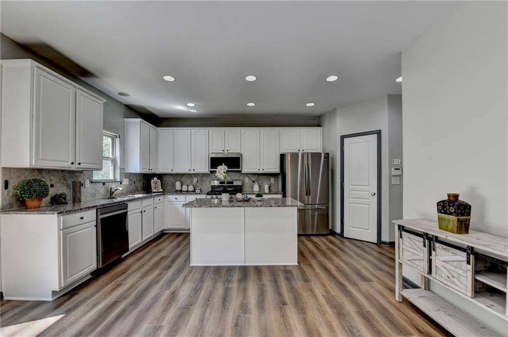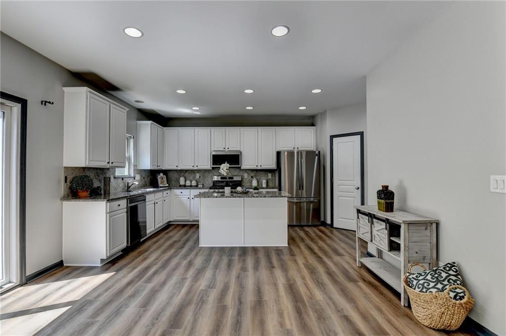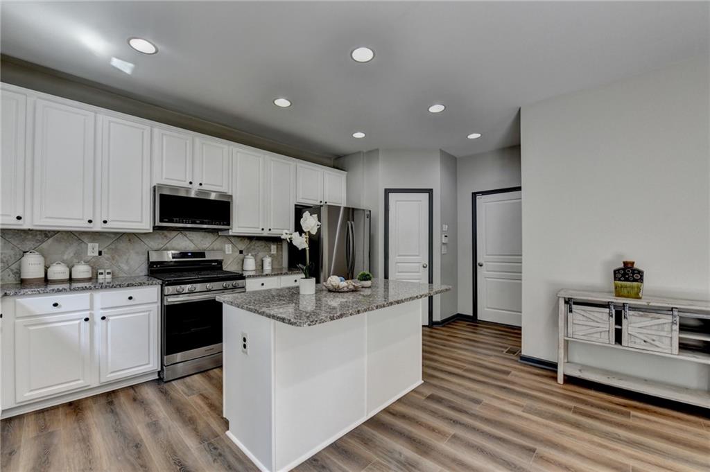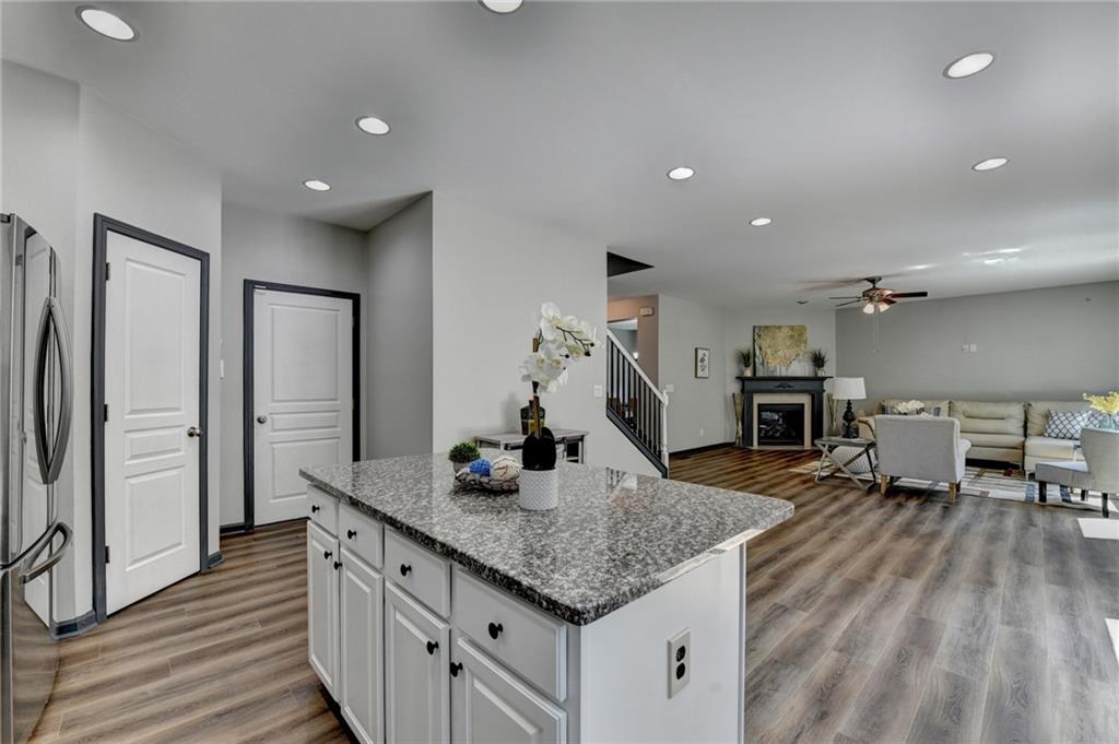 - KitchenCabinets Stain, Eat-in Kitchen, Kitchen Island, Pantry, Stone Counters, View to Family Room