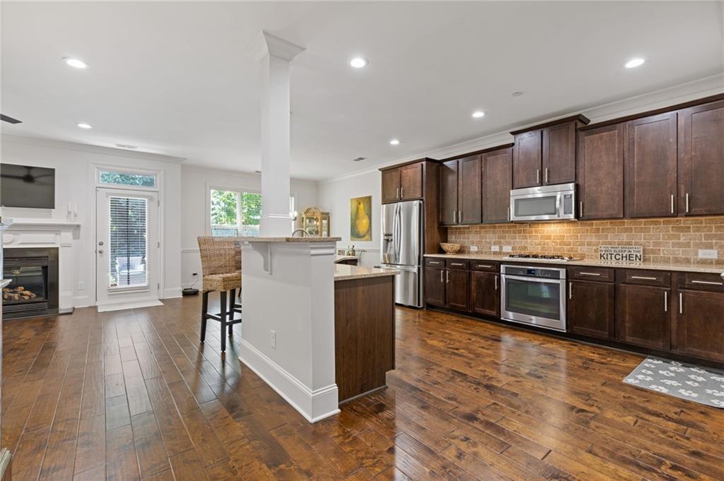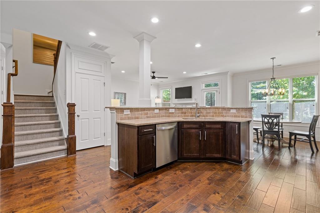 - KitchenBreakfast Bar, Cabinets Stain, Kitchen Island, Pantry Walk-In, Stone Counters, View to Family Room