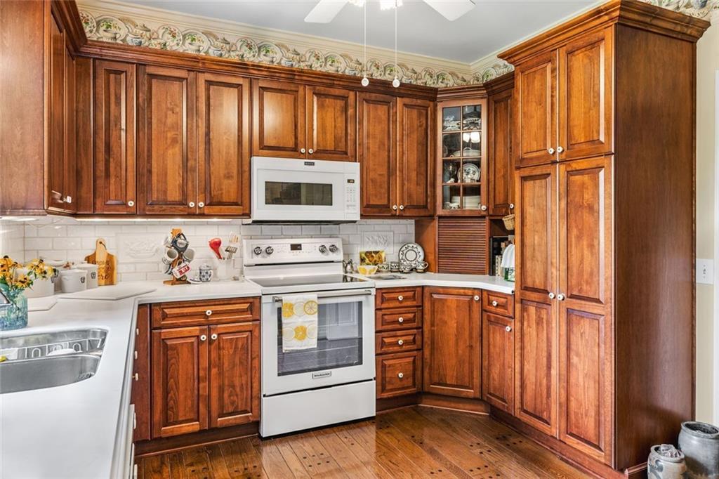 - KitchenEat-in Kitchen, Cabinets White, Other Surface Counters, Solid Surface Counters