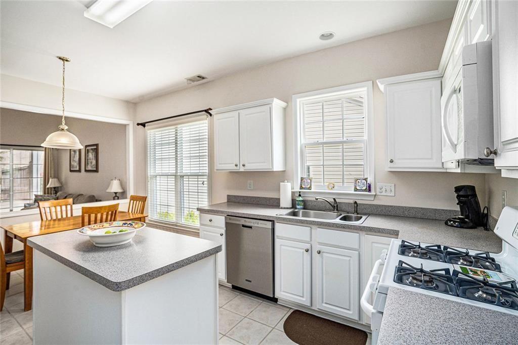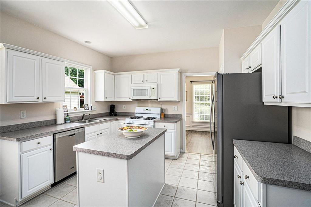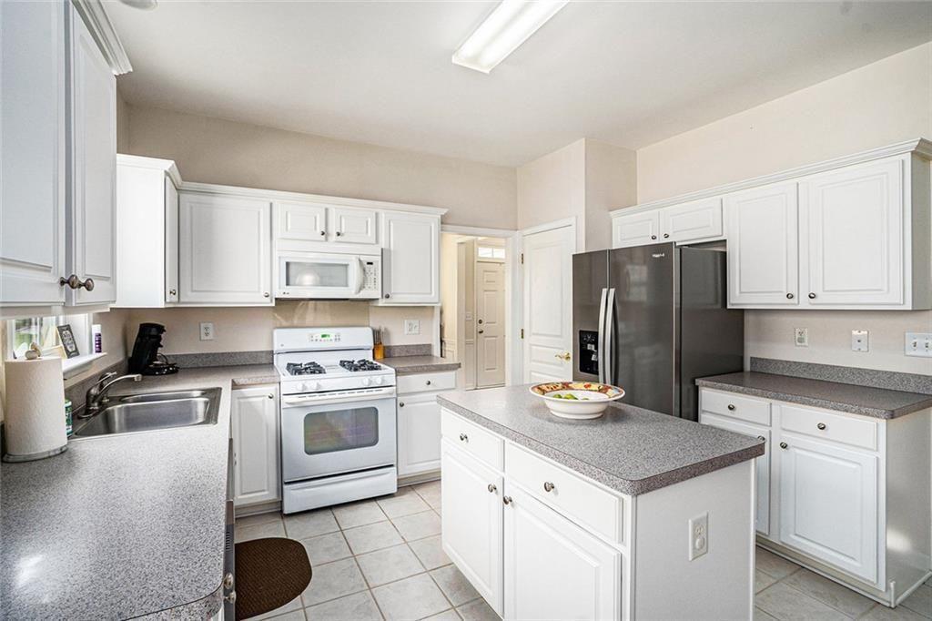 - KitchenCabinets White, Eat-in Kitchen, Kitchen Island, Laminate Counters, Pantry, View to Family Room
