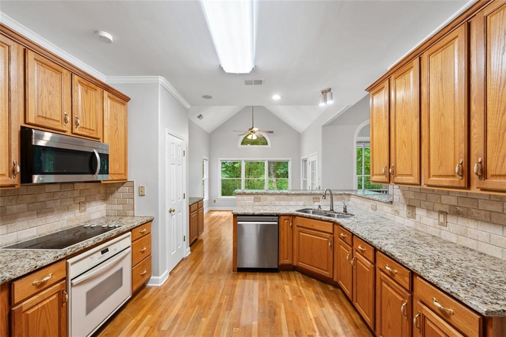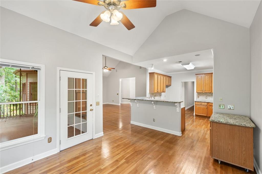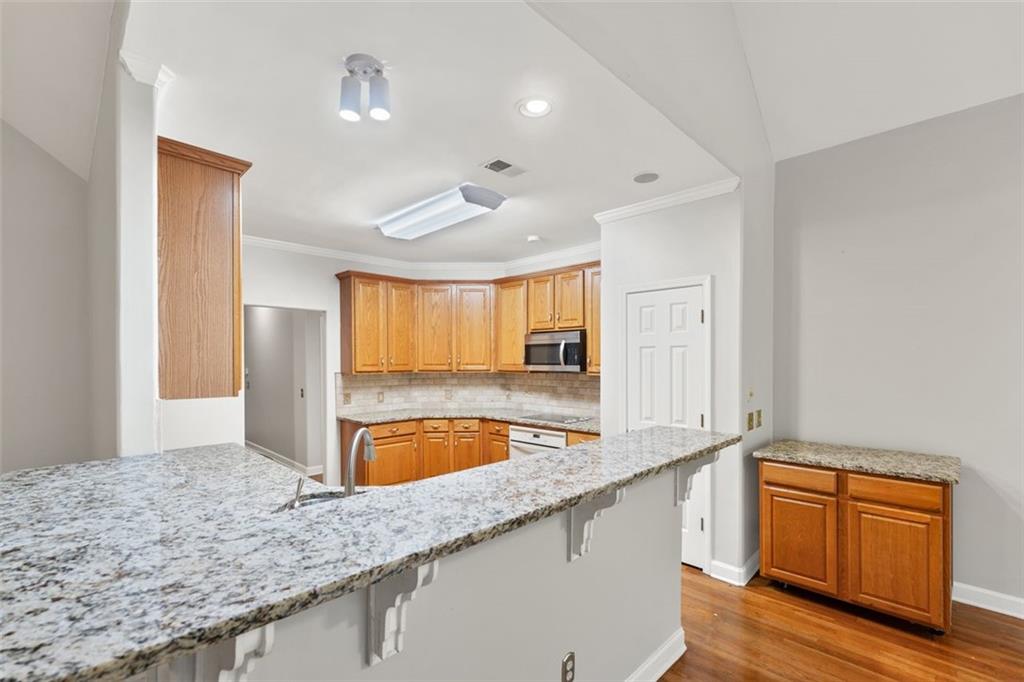 - KitchenBreakfast Bar, Stone Counters, Eat-in Kitchen, View to Family Room