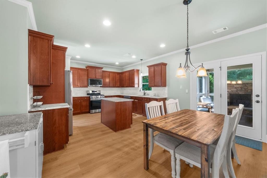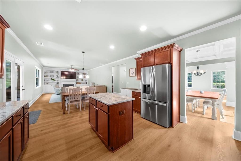 - KitchenCabinets Stain, Eat-in Kitchen, Kitchen Island, Pantry, Stone Counters, View to Family Room