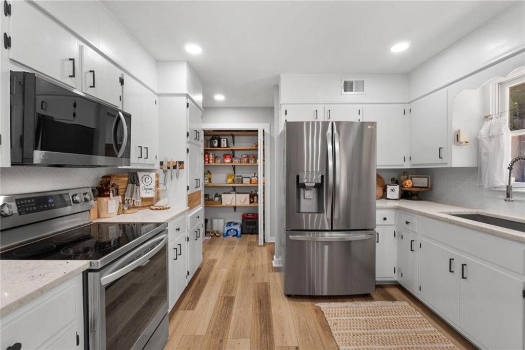 - KitchenCabinets White, Eat-in Kitchen, Pantry, Stone Counters