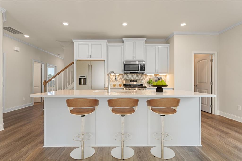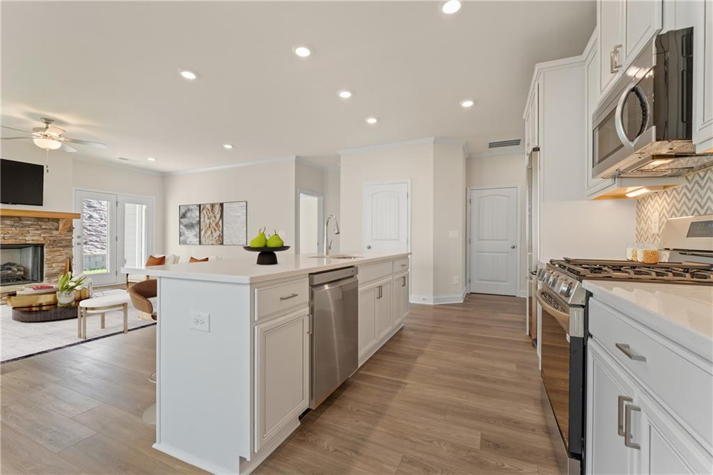 - KitchenBreakfast Bar, Breakfast Room, Cabinets White, Kitchen Island, Pantry Walk-In, Stone Counters, View to Family Room