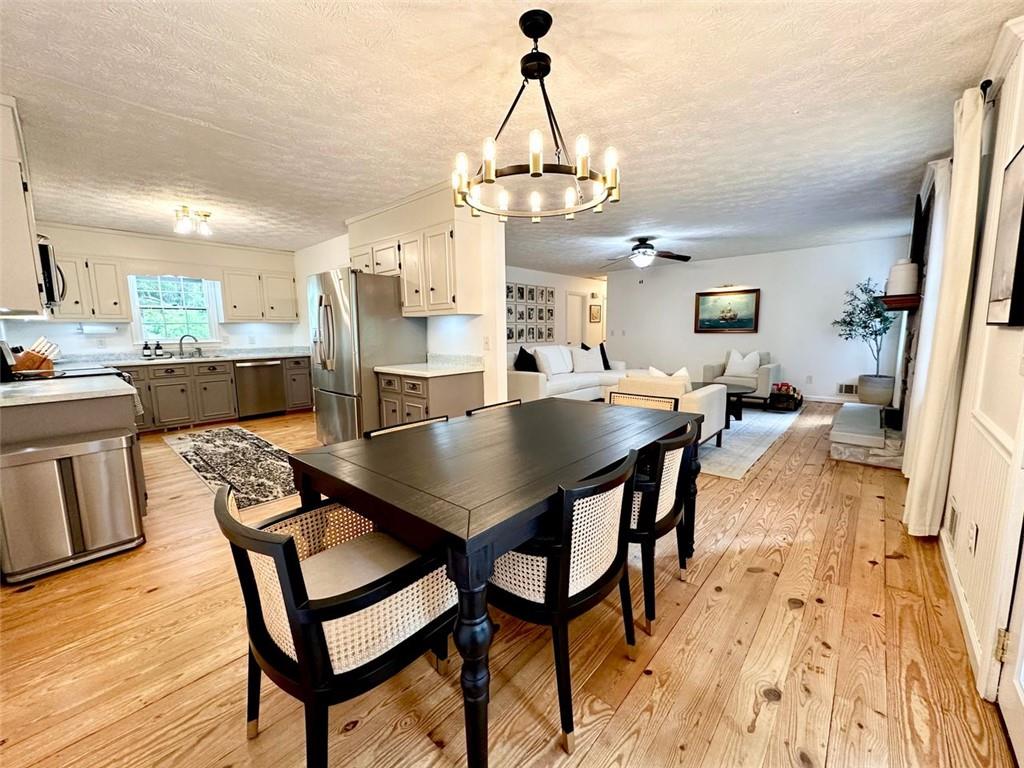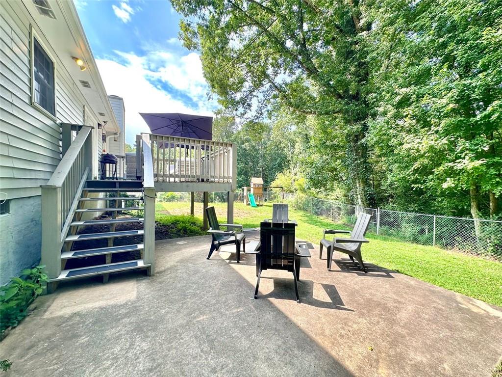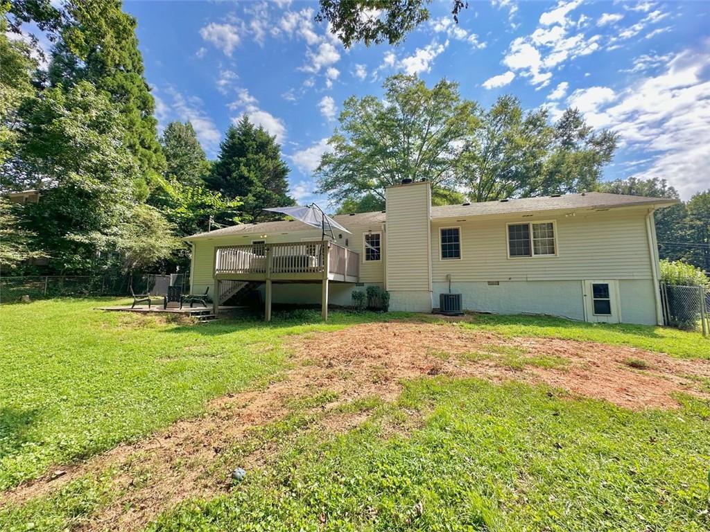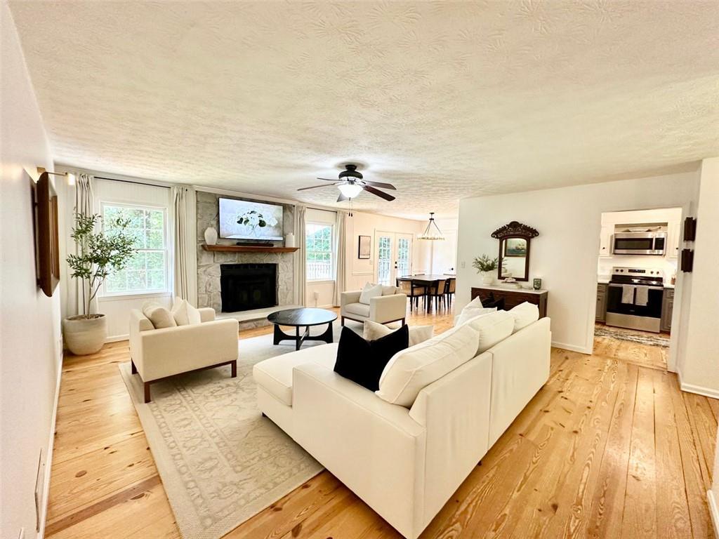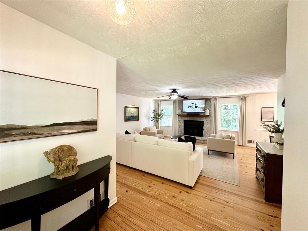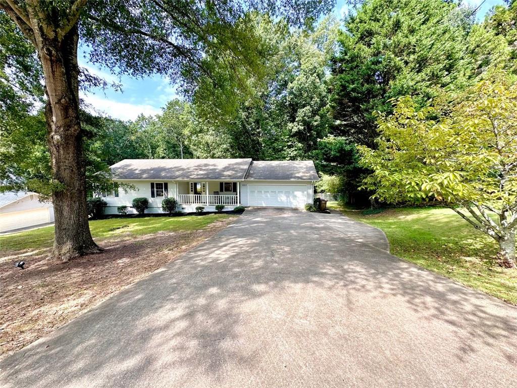 Welcome to your new home! This stunning, move-in-ready ranch offers the perfect blend of modern updates and timeless charm along a wooded, half-acre lot in a serene, established neighborhood with NO HOA. Step inside and be captivated by the open, light-filled living space, featuring beautiful pine wood flooring and a cozy, stone-accented fireplace that creates a warm and inviting atmosphere. The entire interior has been freshly painted, complemented by updated lighting and modern hardware throughout. Retreat to your tranquil oasis in the newly renovated master bathroom, a luxurious space designed for ultimate relaxation. The home offers three spacious bedrooms, each with generous closets, along with a large pantry & laundry room, linen closet and a bonus storage room in the garage. Relax on the rocking chair front porch or head to the backyard to enjoy the spacious deck overlooking a large, fenced-in yard—perfect for entertaining, family fun, and pets. This home's unbeatable location is the epitome of convenience. You're just minutes from Hwy 400 at Exit 13, New Hope Elementary and the highly-anticipated Cumming City Center. Enjoy easy access to the Cumming Fair Grounds, Fowler Park, and Big Creek Greenway for outdoor recreation. Recent updates ensure peace of mind, including a freshly serviced septic tank (2025), a new HVAC system with furnace and A/C (2021), newer water heater (2019), a new smart garage door opener (2020), and a Nest thermostat. The sale also includes all appliances, even the washer and dryer, making this a truly turn-key opportunity. Don't miss your chance to own this remarkable home in a highly sought-after location!