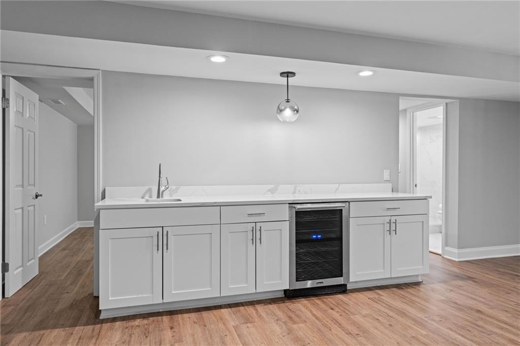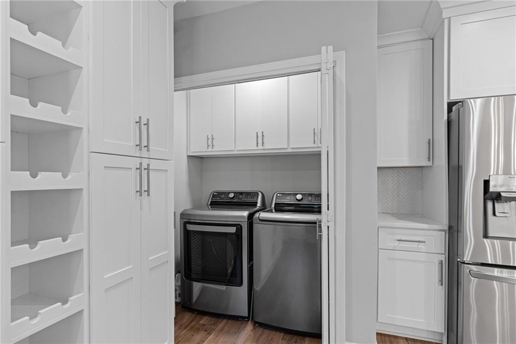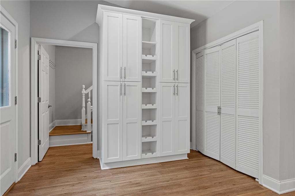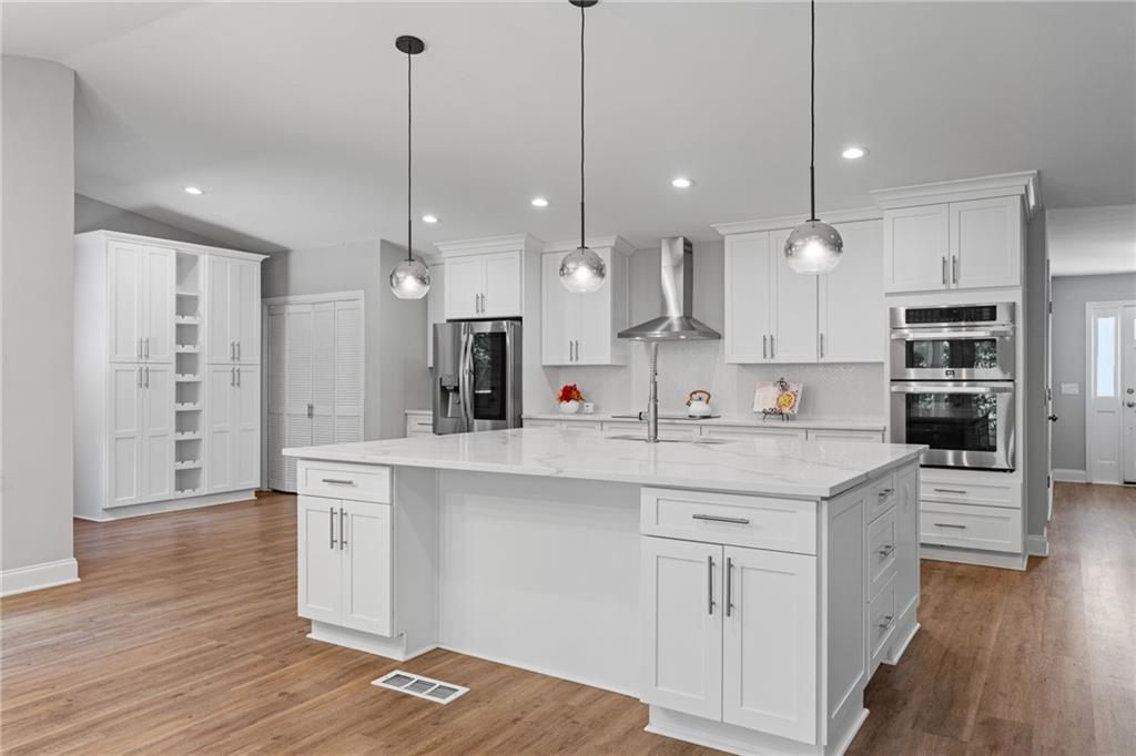 - KitchenCabinets White, Kitchen Island, Pantry, Stone Counters, View to Family Room, Wine Rack