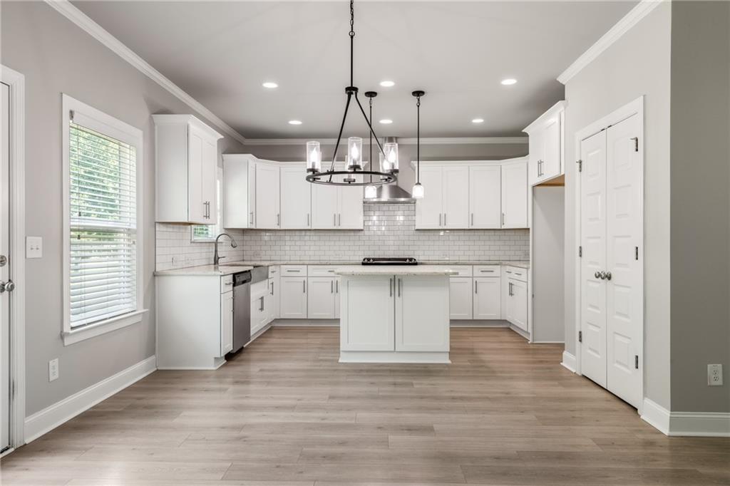 - KitchenBreakfast Room, Cabinets White, Kitchen Island, Pantry, Stone Counters, View to Family Room
