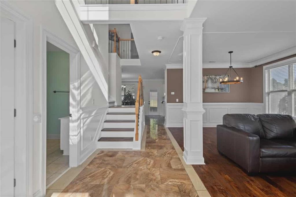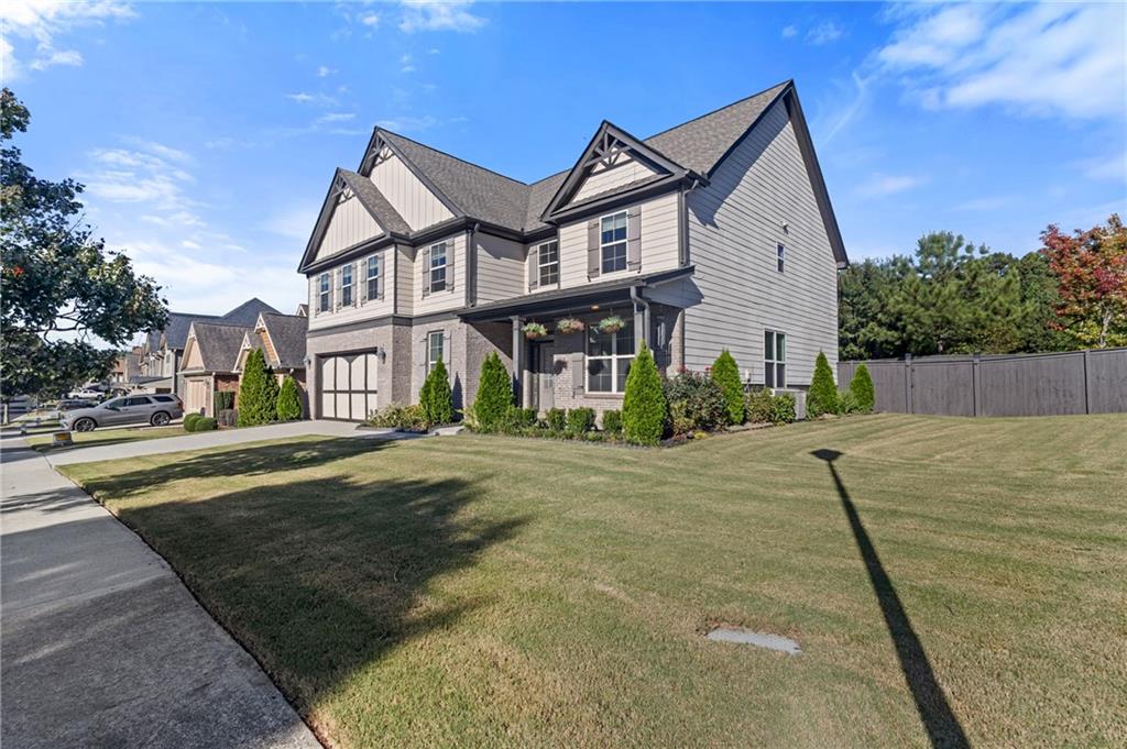 Welcome to this stunning 5-bedroom, 4-bath home filled with natural light. The property offers a level driveway with a 2-car garage and beautiful curb appeal. Stepping inside you'll be greeted by a two-story foyer that opens to a formal living and dining area. This versatile flex space can be customized to fit your lifestyle, perfect for a home office, playroom, or additional entertaining space. Hardwood floors and marble accents add elegance throughout the main level. The open-concept kitchen overlooks the family room and breakfast area, featuring white cabinetry, solid-surface countertops, a kitchen island, tile backsplash, and stainless steel appliances. The family room is the heart of the home with custom built-ins and a cozy fireplace. A guest suite with a full bath on the main level offers flexibility for overnight visitors or a private office. The dual-access staircase adds convenience with entry from both the foyer and kitchen. Upstairs, the oversized primary suite boasts vaulted ceilings, a sitting area, walk-in closet, double vanity, soaking tub, and separate tile shower. Spacious additional bedrooms and two full baths complete the upper level. The large, fenced backyard with solar lighting provides the perfect space for grilling, entertaining, or simply relaxing outdoors. Recent updates include: NEW fenced in backyard with solar lighting, NEW kitchen appliances (microwave, oven, and refrigerator), updated upstairs shared bathroom with a NEW toilet, and NEW Carpet on upper level. This home is located minutes from shopping, dining, Hwy 316, I-85, and zoned for the sought-after Archer High School district. Schedule your showing today!