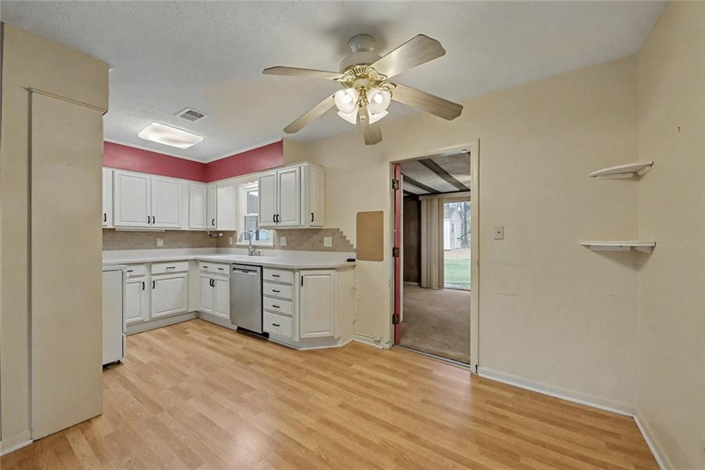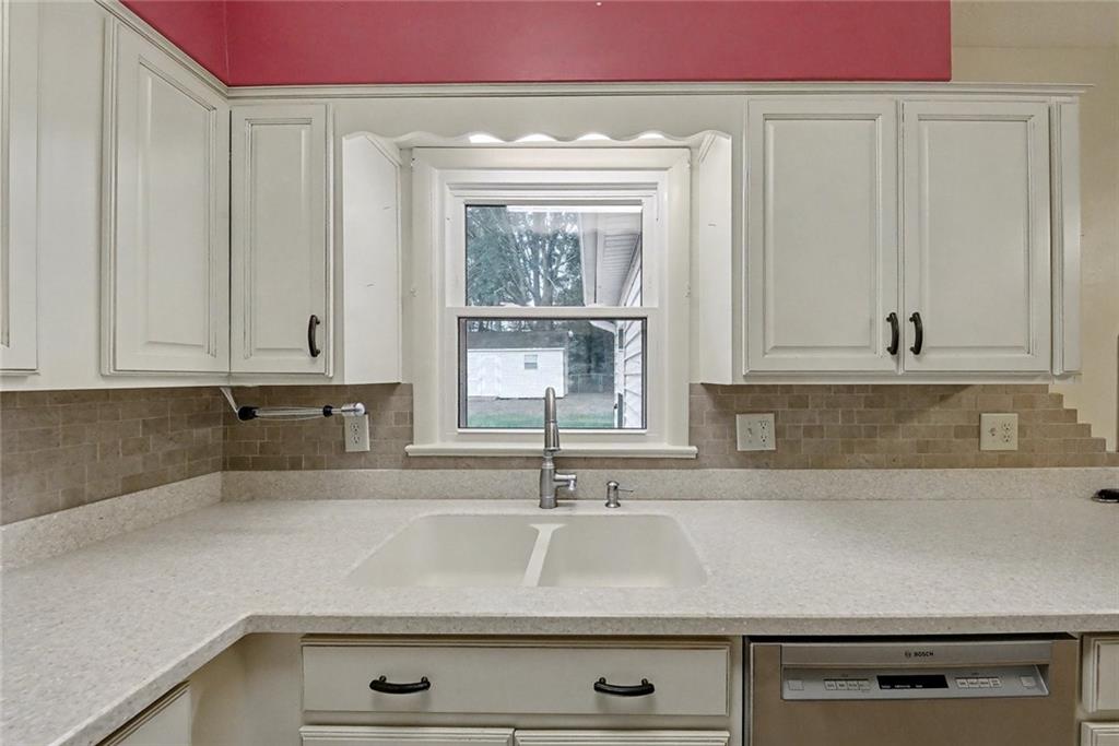 - KitchenCabinets White, Eat-in Kitchen, Solid Surface Counters, View to Family Room