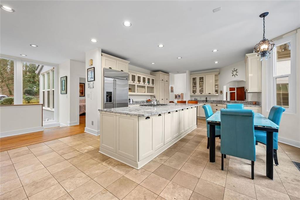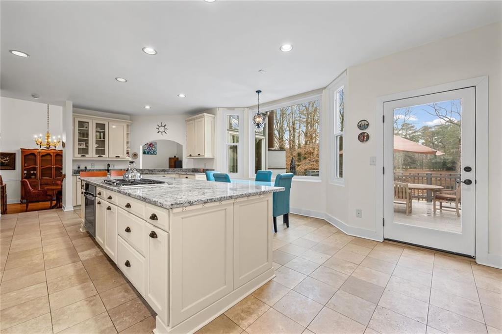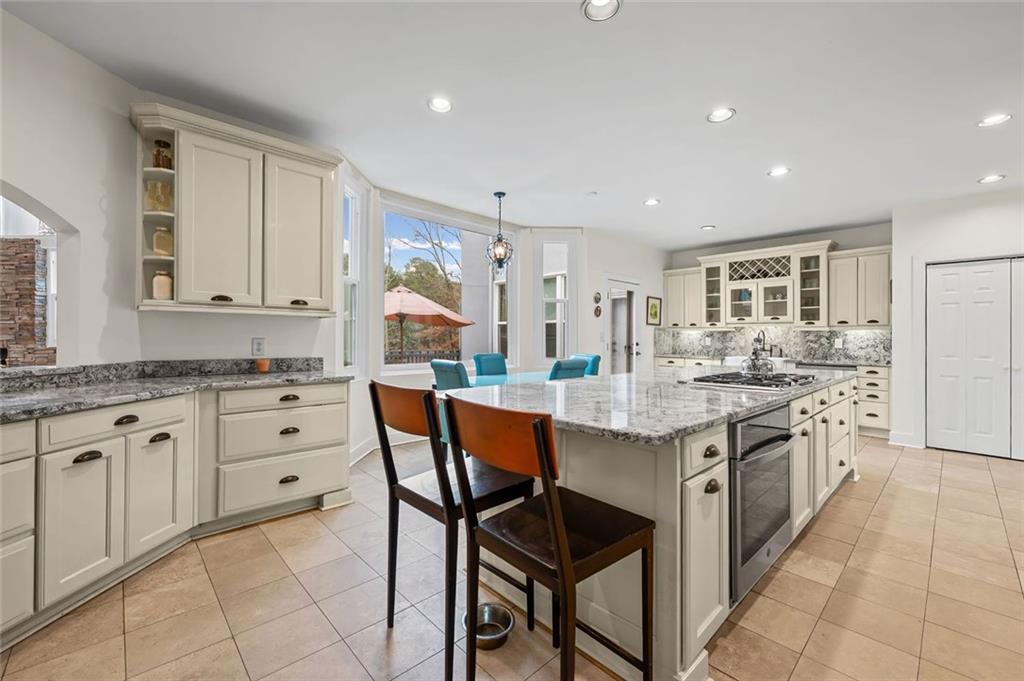 - KitchenCabinets White, Eat-in Kitchen, Kitchen Island, Pantry, Solid Surface Counters, Stone Counters, View to Family Room, Wine Rack