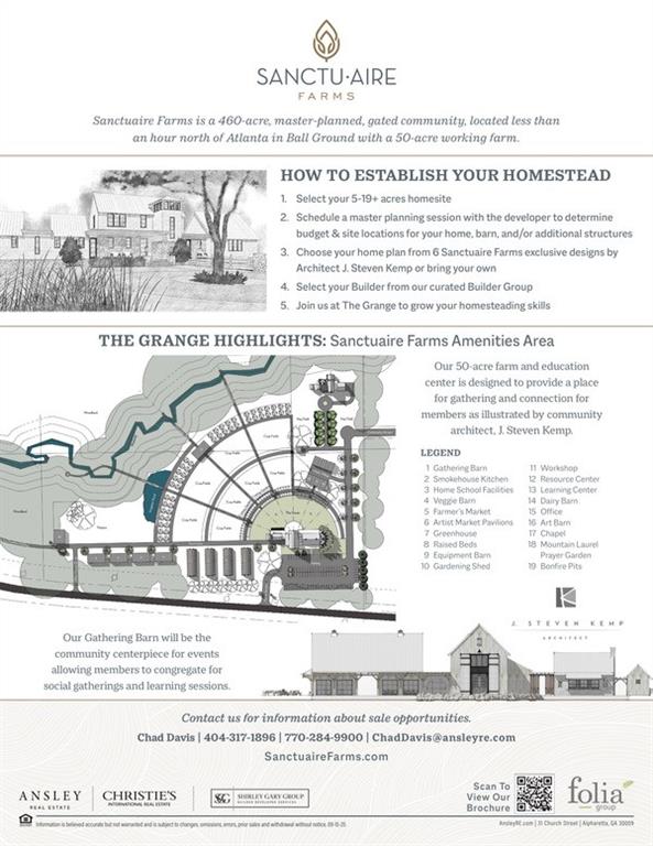 Discover Sanctuaire Farms, a visionary 460-acre Master planned / Gated homesteading community nestled in the serene landscapes of Ball Ground, Georgia. Designed for modern pioneers seeking a harmonious blend of privacy, sustainability, and community, Sanctuaire Farms offers an unparalleled living experience brought to life by award wining architect J Steven Kemp. Property Highlights: • Expansive Private Parcels: Choose from homesites ranging from 5 to 15+ acres, providing ample space for your dream homestead. • Gated Community: Enjoy the security and exclusivity of a gated environment, ensuring peace of mind for you and your family. • Distinctive Architecture: Embrace timeless design with our curated architectural guidelines, fostering a cohesive and aesthetically pleasing community. • Comprehensive Farm Packages: Access complete farm setups, including infrastructure and resources, to kickstart your sustainable living journey. • Community Amenities: Explore walking trails, picnic areas, and shared spaces that encourage connection with nature and neighbors. • Homestead Development Support: Benefit from programs offering guidance on farmstead development, livestock management, and sustainable practices. • Maintenance Resources: Utilize our home and farm maintenance programs to keep your property in optimal condition. • Passive Income Opportunities: Participate in our “Farm-stay” Airbnb program, allowing you to generate income by sharing your homesteading lifestyle with guests. Location & Lifestyle: Situated just an hour north of Atlanta, Sanctuaire Farms provides a tranquil retreat without sacrificing accessibility. The community is a response to the growing desire for a simpler, more self-sufficient lifestyle, offering residents the chance to connect deeply with family, nature, and the land. Join a movement that celebrates freedom, sustainability, and the pioneering spirit. Sanctuaire Farms is more than a place to live—it’s a place to thrive.
