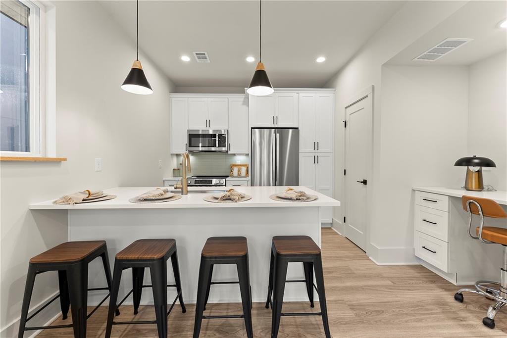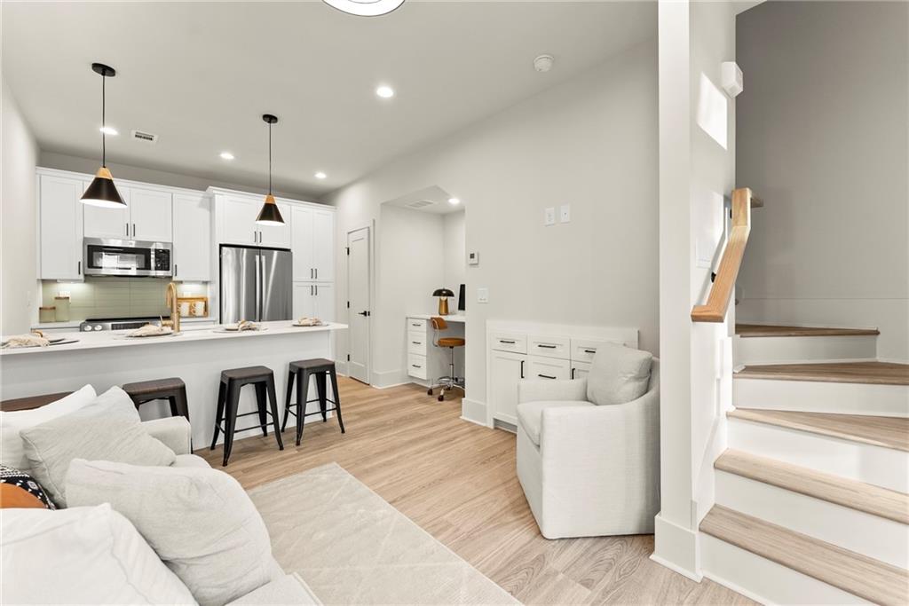 - KitchenBreakfast Bar, Cabinets White, Stone Counters, View to Family Room