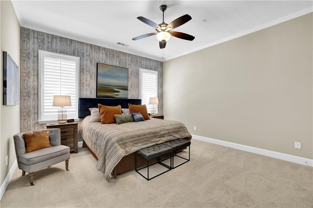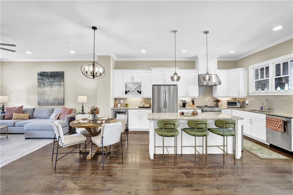 WALK TO MARIETTA SQUARE. LUXURY. DESIGNER KITCHEN. 10FT CEILINGS. Come see this One of a one-of-a-kind beauty where timeless design meets everyday luxury in the heart of Manget, just a stroll from the charm and energy of Marietta Square. This stunning 3-bedroom, 3.5-bath Craftsman townhome offers a beautifully appointed living space designed for both entertaining and relaxation. Inside, you’ll find an airy open-concept layout with natural light pouring through French doors and wide windows. The heart of the home is the designer kitchen, featuring crisp white cabinetry, granite countertops, stainless steel appliances, and a built-in wine fridge, all centered around an oversized island with plenty of seating. Two covered porches, front and back, invite gatherings, barbecues, or lazy Sunday mornings with coffee. Upstairs, the primary suite is a peaceful retreat with a spa-inspired bath complete with soaking tub, glass shower, and double vanities. The custom closet is a dream. The top floor also features a secondary ensuite bedroom and convenient laundry. On the terrace level, you'll find a third bedroom with its own full bath, perfect for a guest room or private office. This level also includes a drop zone/mudroom, generous storage, and direct access to the 2-car garage. Beyond your door, enjoy a friendly, walkable community with a shared firepit and unbeatable access to dining, shopping, parks, and the historic Marietta Square.