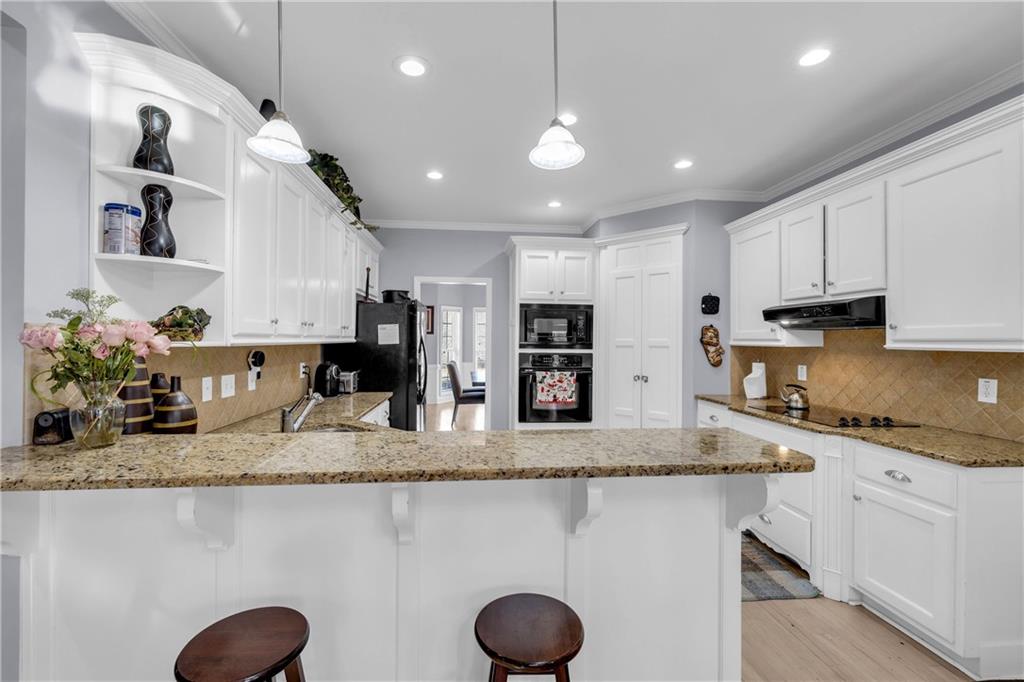 - KitchenBreakfast Bar, Cabinets White, Eat-in Kitchen, Kitchen Island, Pantry Walk-In, Stone Counters, View to Family Room