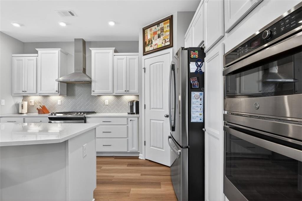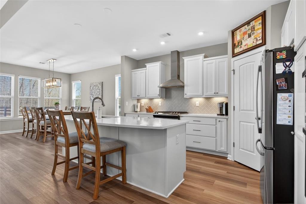 - KitchenCabinets White, Kitchen Island, Pantry Walk-In, Solid Surface Counters, View to Family Room