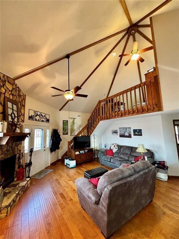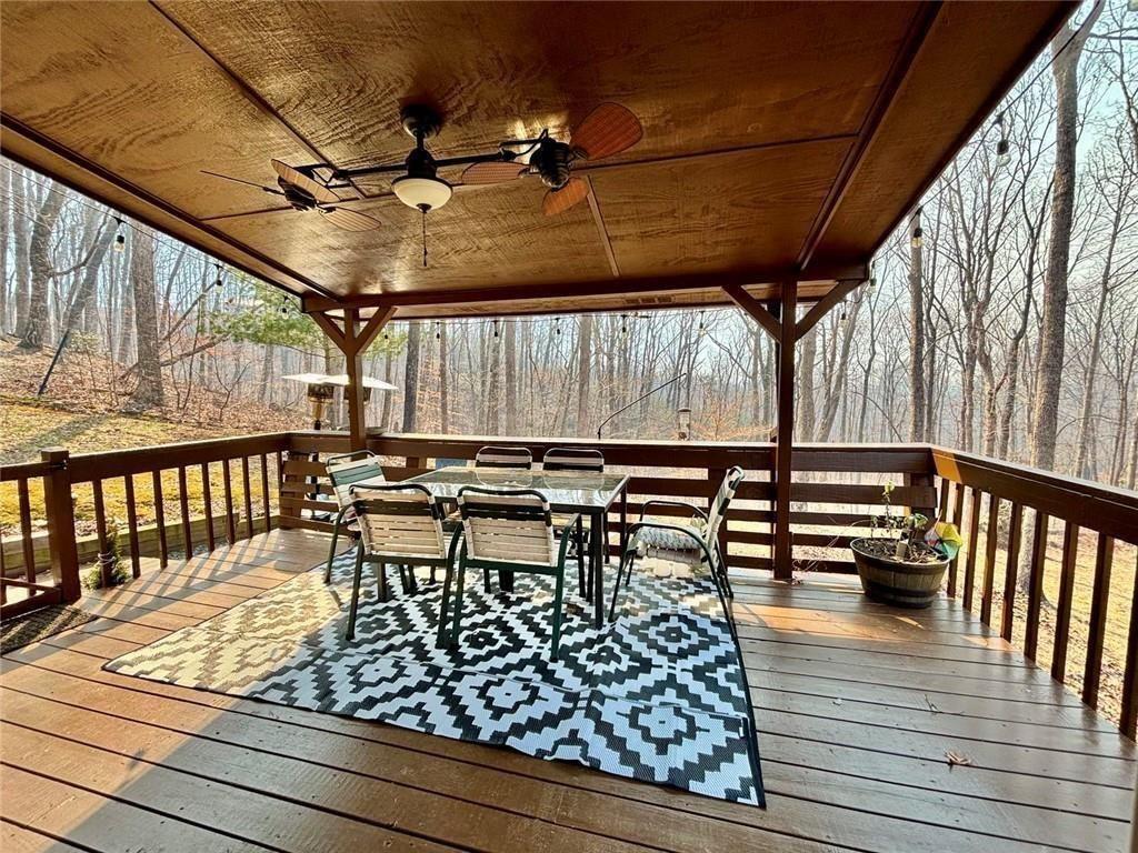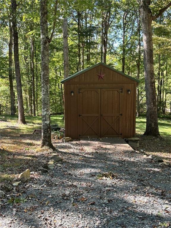 Tucked inside a quiet gated mountain community, this charming cabin retreat blends privacy, comfort, and outdoor living with 1,183 sq ft of inviting space. Built in 1996 2BR/2BA (including a loft-style bedroom), the home offers warm cabin character, central heat & air, —including a propane fireplace and stove. Kitchen offers stainless steel appliances and beautiful granite countertops. Outdoor living is the star here: enjoy a spacious covered back deck with ceiling fans and string lights—perfect for dining and entertaining—plus additional deck space that’s been updated and well maintained. Sit by the new fire pit area creating an ideal gathering spot for evenings in the woods. The property also includes a storage shed, an easy-access driveway, and a level to gently sloped yard. Take in a seasonal mountain view that adds to the true North Georgia feel. Sold partially furnished —so you can settle in and start enjoying right away. Practical upgrades and care show throughout: water heater and HVAC are well maintained. A generator stays with the home, and the owned propane tank also conveys. Community water and septic system. WiFi/cable available. Conveniently located about 15 minutes to downtown Ellijay and 25 minutes to Blue Ridge, with nearby wineries, hiking, and outdoor adventure. Community fees and community water from the mountains. This community does not allow short-term rentals.