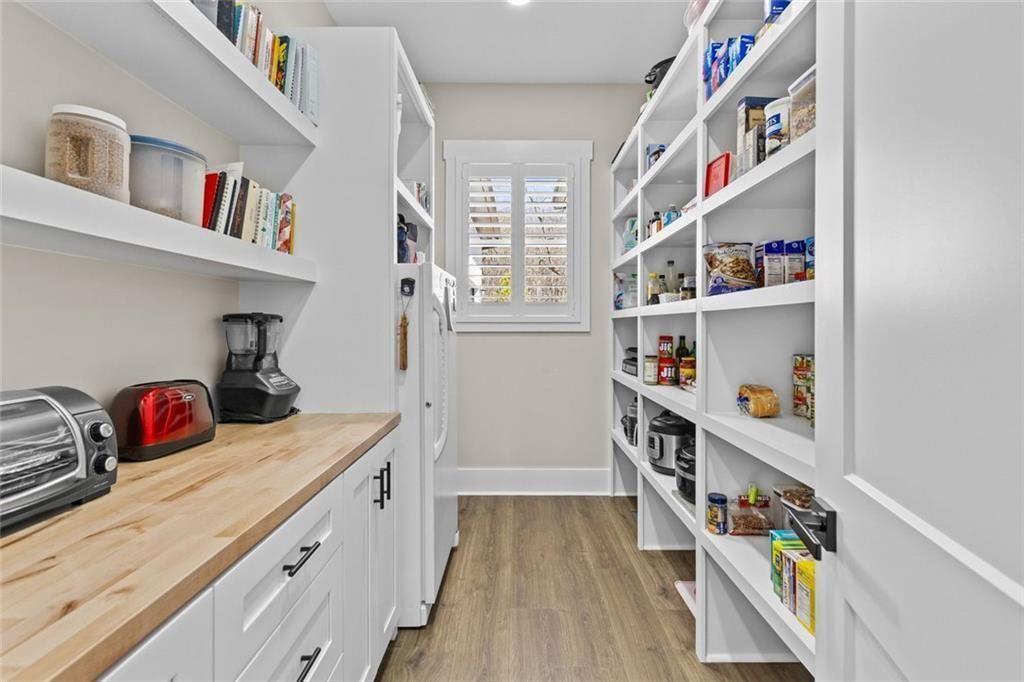 - KitchenCabinets White, Solid Surface Counters, Eat-in Kitchen, Kitchen Island, Pantry Walk-In, View to Family Room