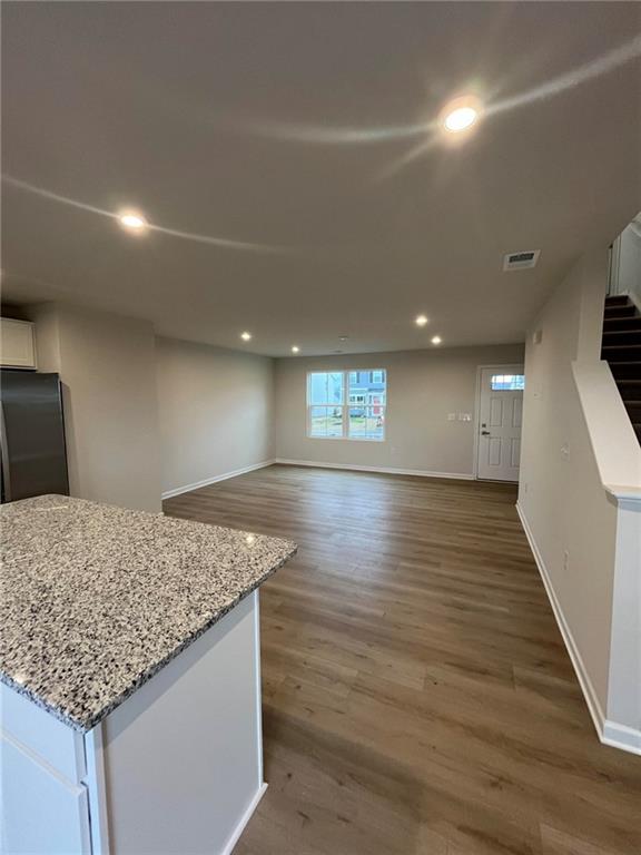 - KitchenEat-in Kitchen, Kitchen Island, Pantry, Solid Surface Counters, Stone Counters, View to Family Room