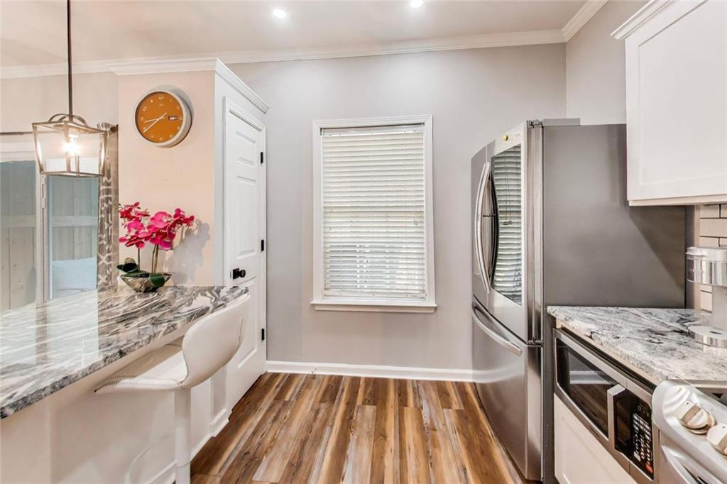 - KitchenBreakfast Bar, Cabinets White, Pantry, Stone Counters