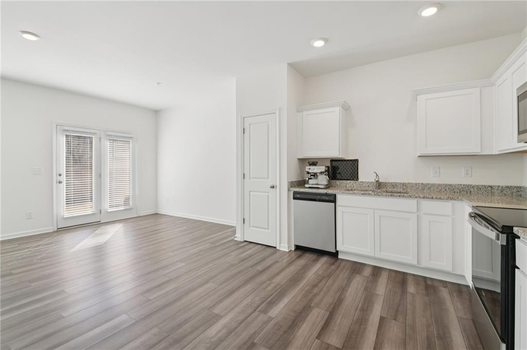 - KitchenCabinets White, Pantry, Stone Counters, View to Family Room