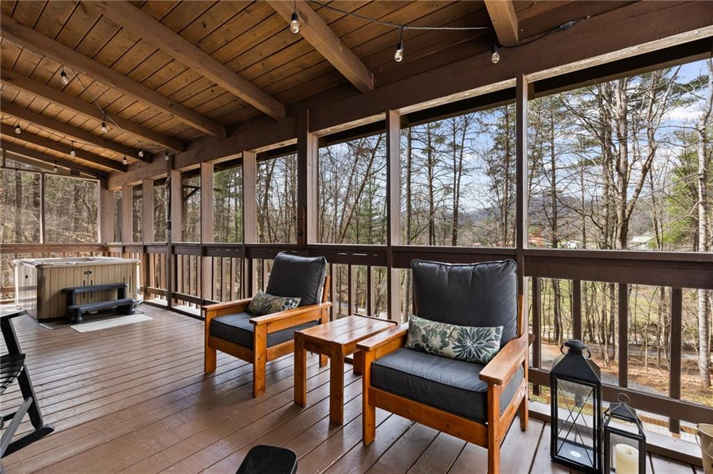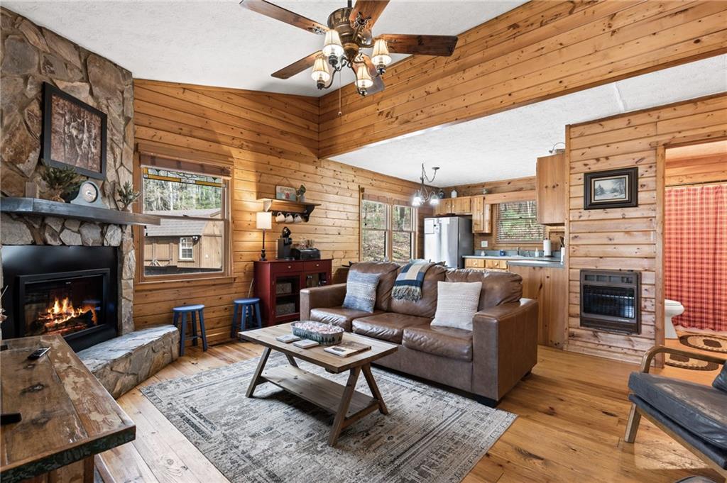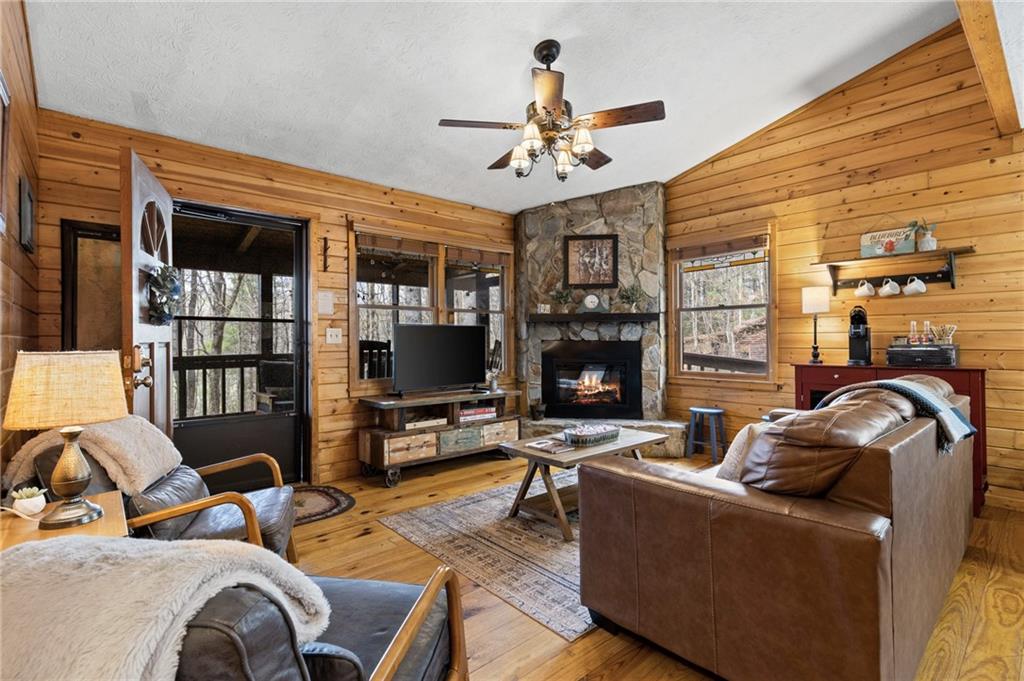 This charming cabin is the perfect opportunity for a primary residence, second home, or income-producing vacation rental. Surrounded by panoramic mountain views, it offers a peaceful retreat where you can truly relax. Enjoy your mornings and evenings on the covered, furnished screened porch, relax in the private hot tub, or gather around the fire pit for cozy nights under the stars. The soothing sounds of Fightingtown Creek create a serene backdrop with a community picnic and fireplace area. Enjoy the recently converted electric fireplace on cooler evenings. Inside, this well-maintained 2-bedroom, 1-bath home features an open floor plan, hardwood floors, and a vaulted ceiling that enhances the spacious feel. The home is exceptionally clean and thoughtfully decorated, making it move-in or rental-ready. Recent upgrades include: New HVAC (2024), New decking (2024), Electric fireplace (2024), Metal Roof (2019) Designed with accessibility in mind, the cabin features wide doorways and step-free access, making it accessible to all guests. Located near a wide variety of attractions and outdoor activities, you’ll have easy access to scenic train rides, whitewater rafting, zip-lining, golf, fishing, hiking trails, waterfalls, local wineries and breweries, seasonal fruit picking, and many of the local festivals. Plus, you’re just a short drive from the shops and restaurants of downtown Blue Ridge. This is mountain living at its best—whether you're looking for a personal getaway or a smart investment.