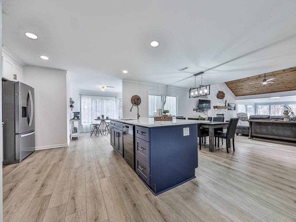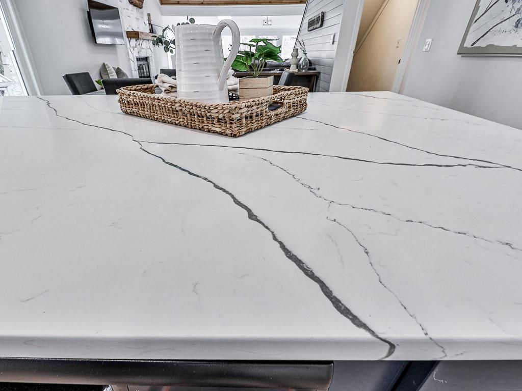 - KitchenBreakfast Room, Cabinets White, Kitchen Island, Stone Counters, View to Family Room