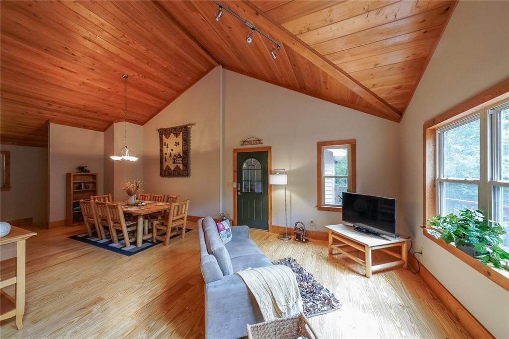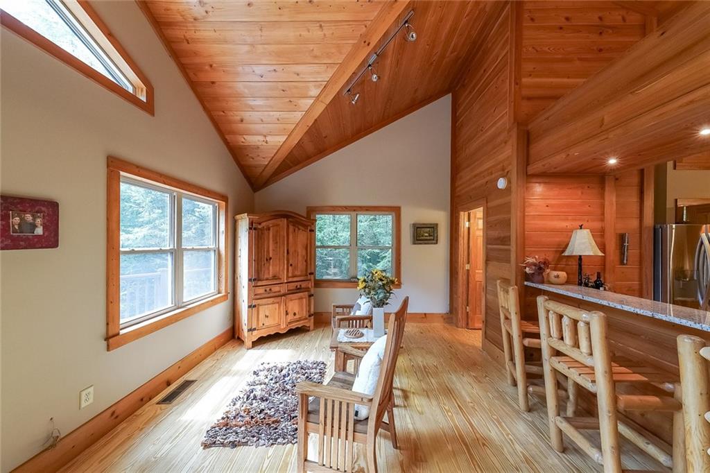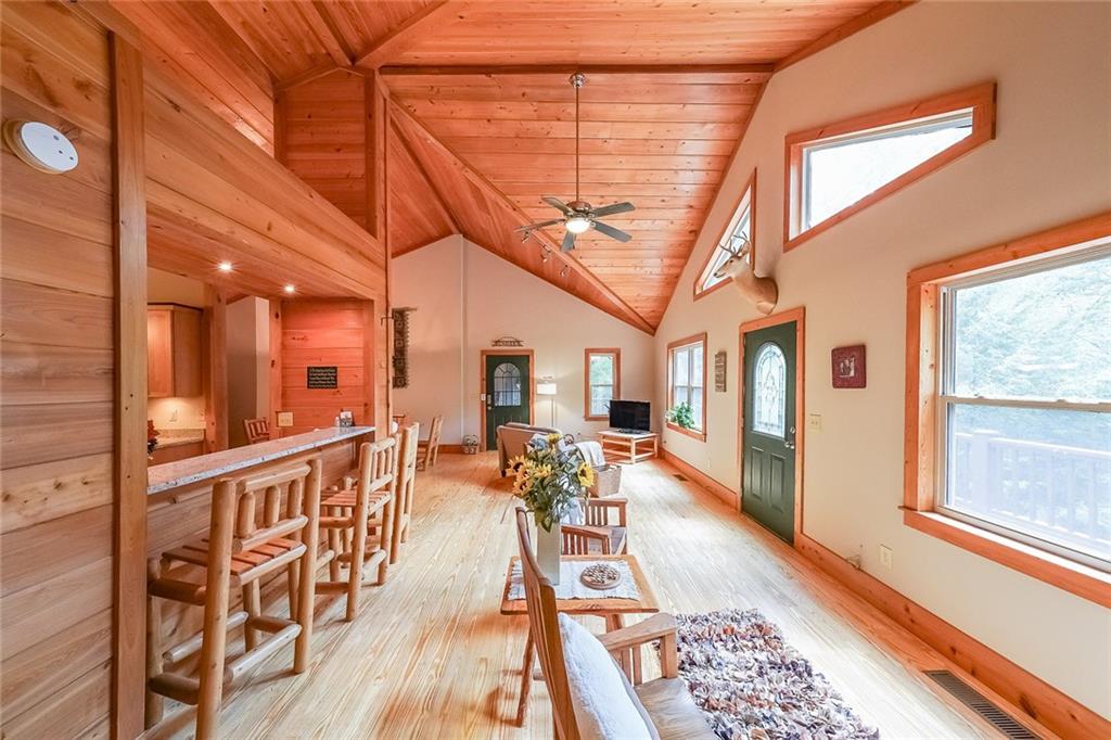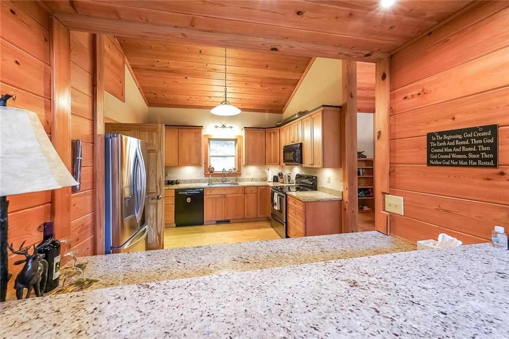 Opportunity to own a custom home with over 275ft of rare river frontage, with fire pit, surrounded by mature Hemlocks, Laurels and beautiful Hardwoods in a warm, sunny location! Your new Mountain Getaway offers both a relaxed lifestyle for your personal enjoyment - and the possibility for short-term rentals in the future. Or just make your retirement dream a reality now! Built by the original owners, this appealing home has been renovated in 2025 and includes *New Pine and LVT Flooring *Fresh Neutral paint throughout *Granite On Kitchen Counters and Island and new Farmhouse Sink *Upgraded Walk-in-Pantry *New LG Fridge/Freezer *All new PEX plumbing throughout *New Bath, Toilets and Fixtures on Lower Level *Refinished Cypress trimwork *Newer HVAC system *Screened covered Breezeway *New Landscape steps with stone accents *Solar Lighting *New Sentricon system *Fresh Gravel & Mulch plus more! LOWER LEVEL features include a central gathering space around a raised Wood Burning Stove, plus 2 adjacent Bedrooms (each with walk-on-closet), a Separate Toilet with sink & cabinetry, and a separate Shower with sink & cabinetry - both rooms connect. There is under-stair storage as well. UPPER/MAIN LEVEL features a Spacious Kitchen (great for entertaining), Kitchen Island, Great sized Pantry, open Dining Area, and a warm, sunny Family Room with impressive Cypress Ceilings. A Guest Bathroom leads off the Living Room. COVERED BREEZEWAY connects the Main Living Area and the Master Bedroom, and is screened, has Dining Options, and connects both to the Front Deck, and to the Rear Area (for grilling, gardening, or relaxing. This area can accommodate a hot-tub also! MASTER BEDROOM features Cypress and Pine and is an Oasis away from the central living room. With its own Ensuite and walk-in-closet, this is your own private sanctuary with view of the river. Cedar LOG Furniture is included (Dining Table with 6 chairs, Coffee Table, 3 Bar Stools, 3 Wood Rockers, 2 sets of Double Bunk Beds, 1 Queen Bed), plus other items. BASEMENT includes Laundry with Utility Tub, Workshop and always appreciated Storage! This could also be converted to a game room. UNIQUE OUTDOOR FEATURES: This lot has much larger river frontage than most, and offers river access, firepit and multiple gathering areas close to the river (great for tubing and kayaking). Plus you'll enjoy up to a 1 mile walk along the shared roadway access easement which flanks the river - great trail for easy walks! Make your move to Ellijay soon and enjoy everything from hiking, mountain biking, cider sampling, wine tasting and local entertainment - all with a small town feel! Don't let this riverfront opportunity slip away!