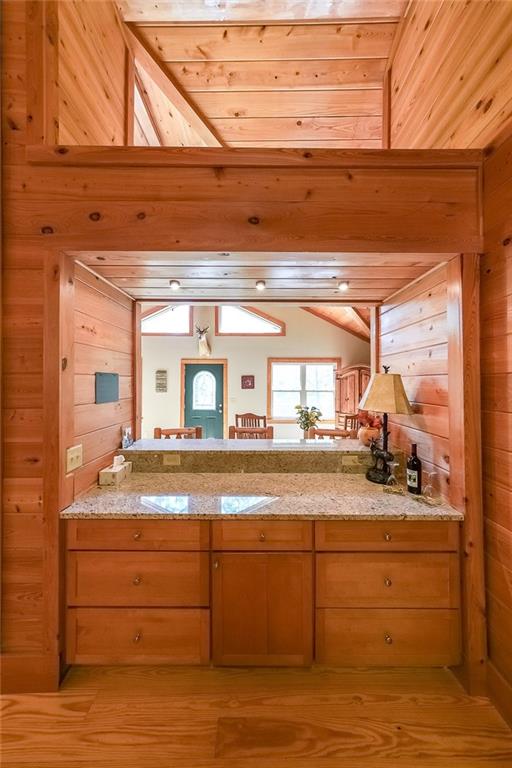 - KitchenBreakfast Bar, Cabinets Stain, Kitchen Island, Other Surface Counters, Pantry Walk-In, Solid Surface Counters, View to Family Room