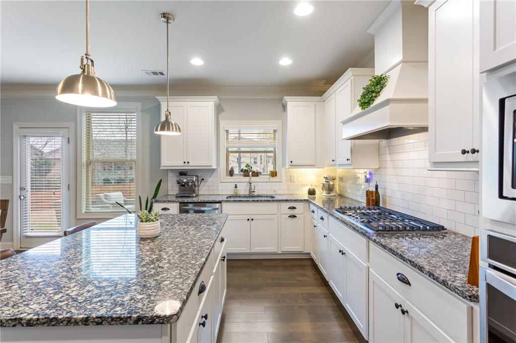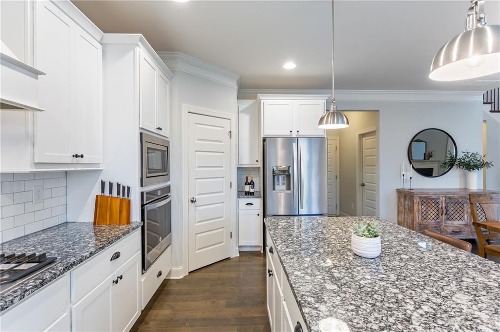 - KitchenCabinets White, Eat-in Kitchen, Kitchen Island, Pantry Walk-In, Stone Counters, View to Family Room